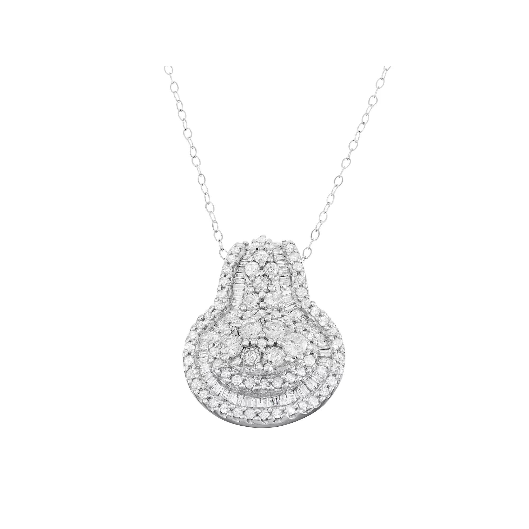 Adorned with round- and baguette-cut diamonds situated in a unique halo motif, this 10k white gold necklace is especially gorgeous.PENDANT DETAILSPendant length: .78 in.Chain length: 18 in.Clasp: spring-ring Metal: 10k white goldDIAMOND DETAILSTotal weight: 1 ct.Shape: round, baguetteColor grade: I-JClarity: I2-I3Setting: prong, channelImage(s) may be enlarged to show detail.Diamond weights are approximate. Diamond total weights may vary between .01 and .08 ct. Some diamonds have fewer than 17 facets.Please note, due to the high value of this item, a signature may be required upon delivery.Gemstones may have been treated to enhance their appearance. Special care may be required. Please visit our Gemstone Treatment & Special Care Guide for more information. Size: 18". Gender: female. Age Group: adult.
