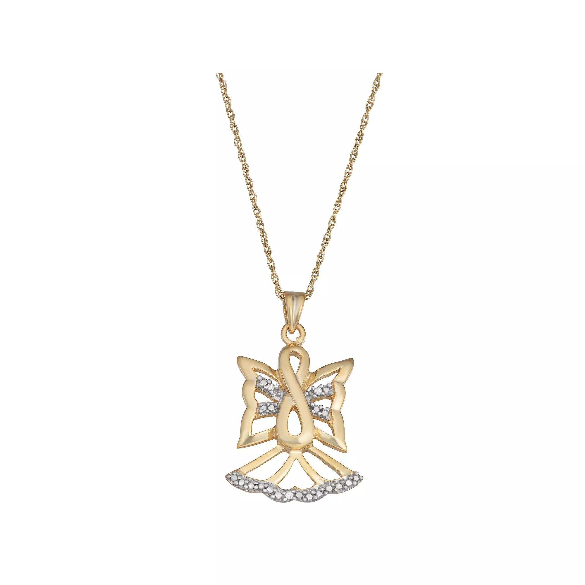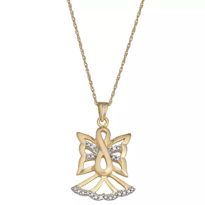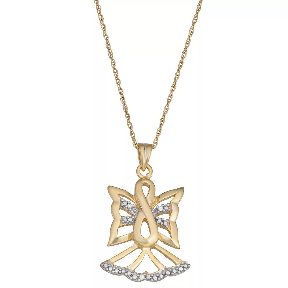 Add a beautiful statement piece to your ensemble with this infinity angel pendant necklace, adorned with sparkling diamond accents. Add a beautiful statement piece to your ensemble with this infinity angel pendant necklace, adorned with sparkling diamond accents. Clasp: spring-ring Nickel free Metal: sterling silver Chain length: 18 in. Plating: 14k gold, rhodium Finish: polished Pendant size: 1 in. x 0.59 in. Chain type: ropeDIAMOND DETAILS Total weight: less than 1/10 ct. Color grade: I Clarity: I2 Shape: round brilliant Setting: pave Diamond weights are approximate. Diamond Total Weights may vary between .01 and .13 ct. Some diamonds consist of fewer than 17 facets. Gemstones may have been treated to enhance their appearance. Special care may be required. Please visit our Gemstone Treatment & Special Care Guide for more information. Image(s) may be enlarged to show detail. Please note, due to the high value of this item, a signature may be required upon delivery. Size: 18". Color: Yellow. Gender: female. Age Group: adult.