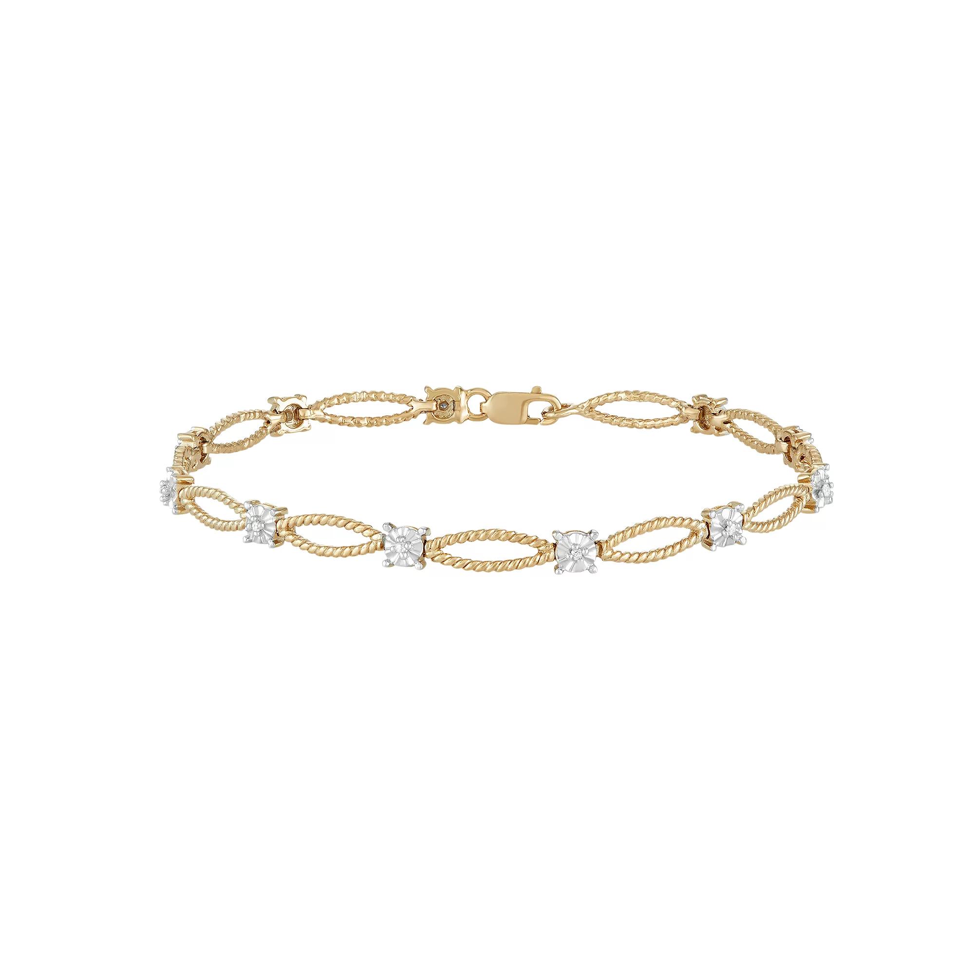 Featuring miracle-set diamond accents and rope-textured links, this 14k gold over silver bracelet makes a chic addition to your look. BRACELET DETAILSLength: 7.25 in.Clasp: lobster clawMetal: sterling silverPlating: 14k gold, silver tonePackaging: boxedDIAMOND DETAILSTotal weight: less than 1/10 ct.Shape: roundColor grade: H-IClarity: I2-I3Setting: miracleGemstones may have been treated to enhance their appearance. Special care may be required. Please visit our Gemstone Treatment & Special Care Guide for more information.Image(s) may be enlarged to show detail.Diamond weights are approximate. Diamond total weights may vary between .01 and .08 ct. Some diamonds have fewer than 17 facets. Size: One Size. Color: White. Gender: female. Age Group: adult. Material: Gold Over Sterling.