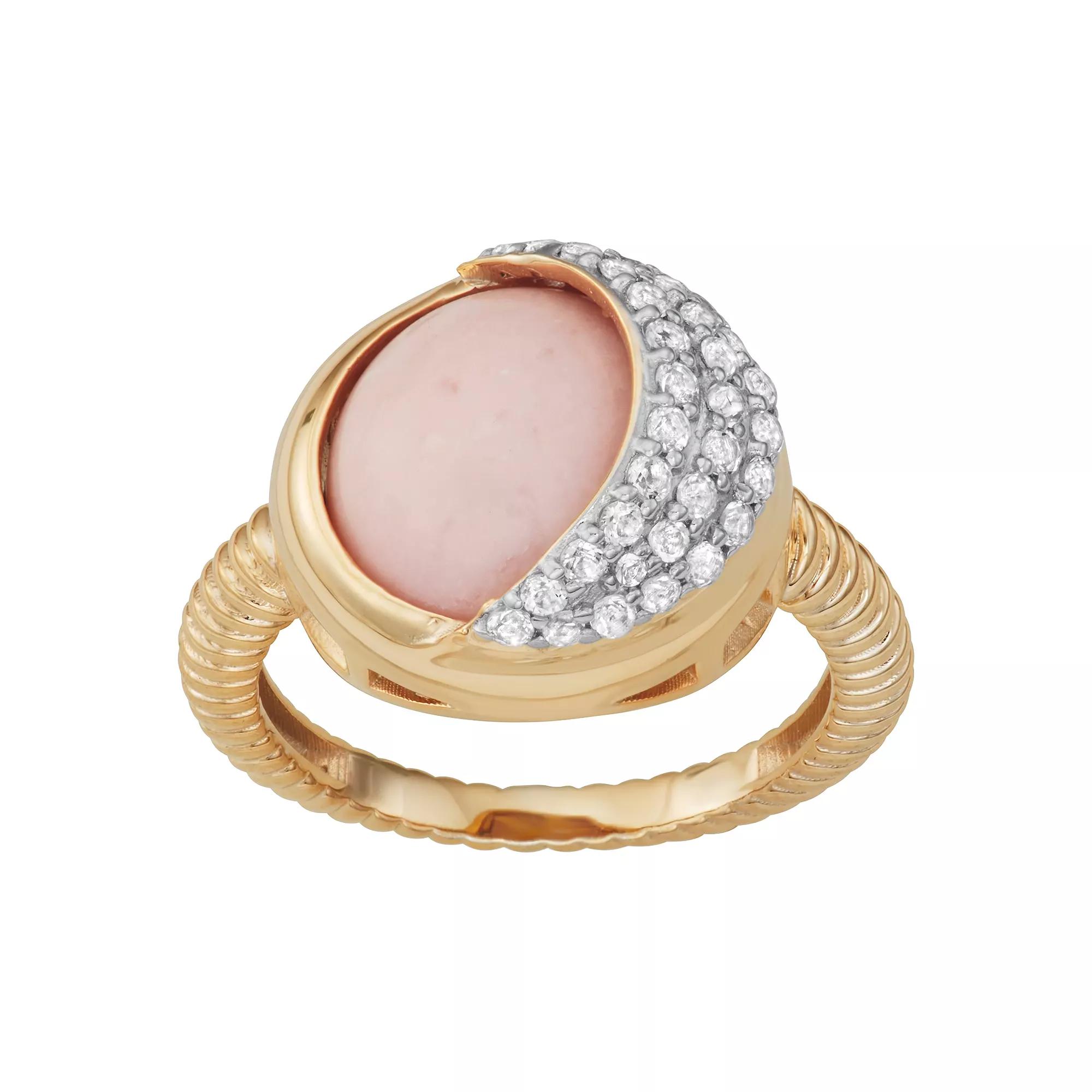 You're sure to love the unique charm of this pink opal and white topaz ring. You're sure to love the unique charm of this pink opal and white topaz ring. Metal: sterling silver Plating: 14k gold, rhodium Width: 2.20 mm Finish: polishedSTONE DETAILS Stone type: pink opal, white topaz Total weight: 6 1/2 ct. Center stone size: 12 mm x 12 mm Shape: round cabochon Setting: bezel Gemstones may have been treated to enhance their appearance. Special care may be required. Please visit our Gemstone Treatment & Special Care Guide for more information. Please note, due to the high value of this item, a signature may be required upon delivery. Color: Yellow. Gender: female. Age Group: adult. Material: Gold Over Sterling.