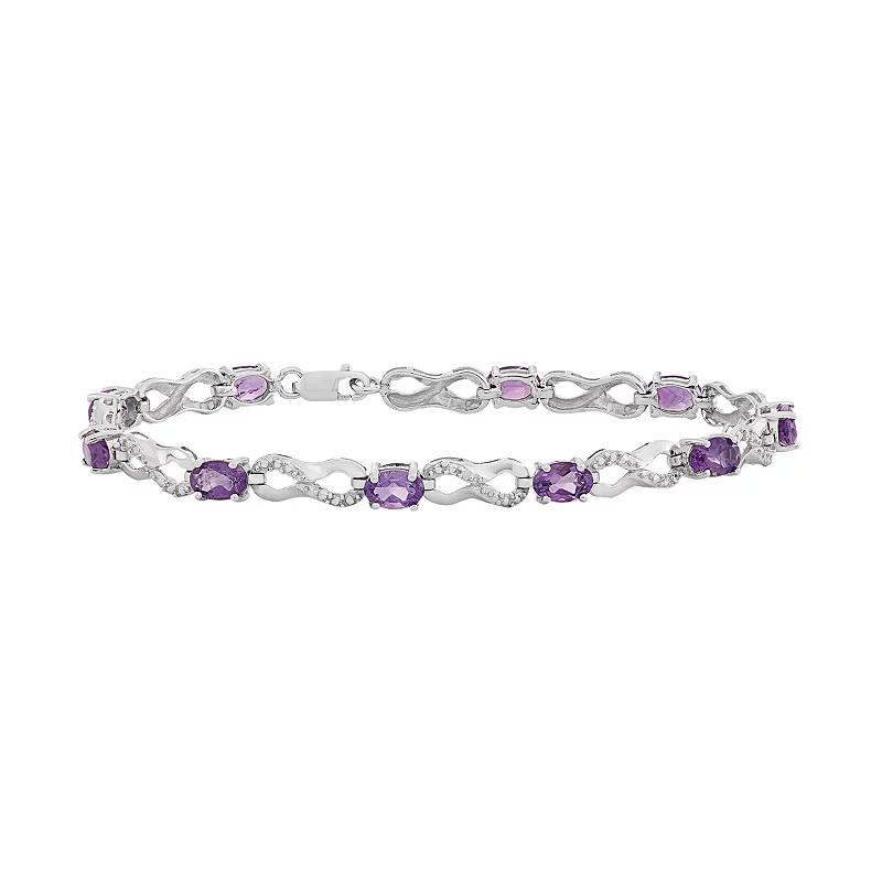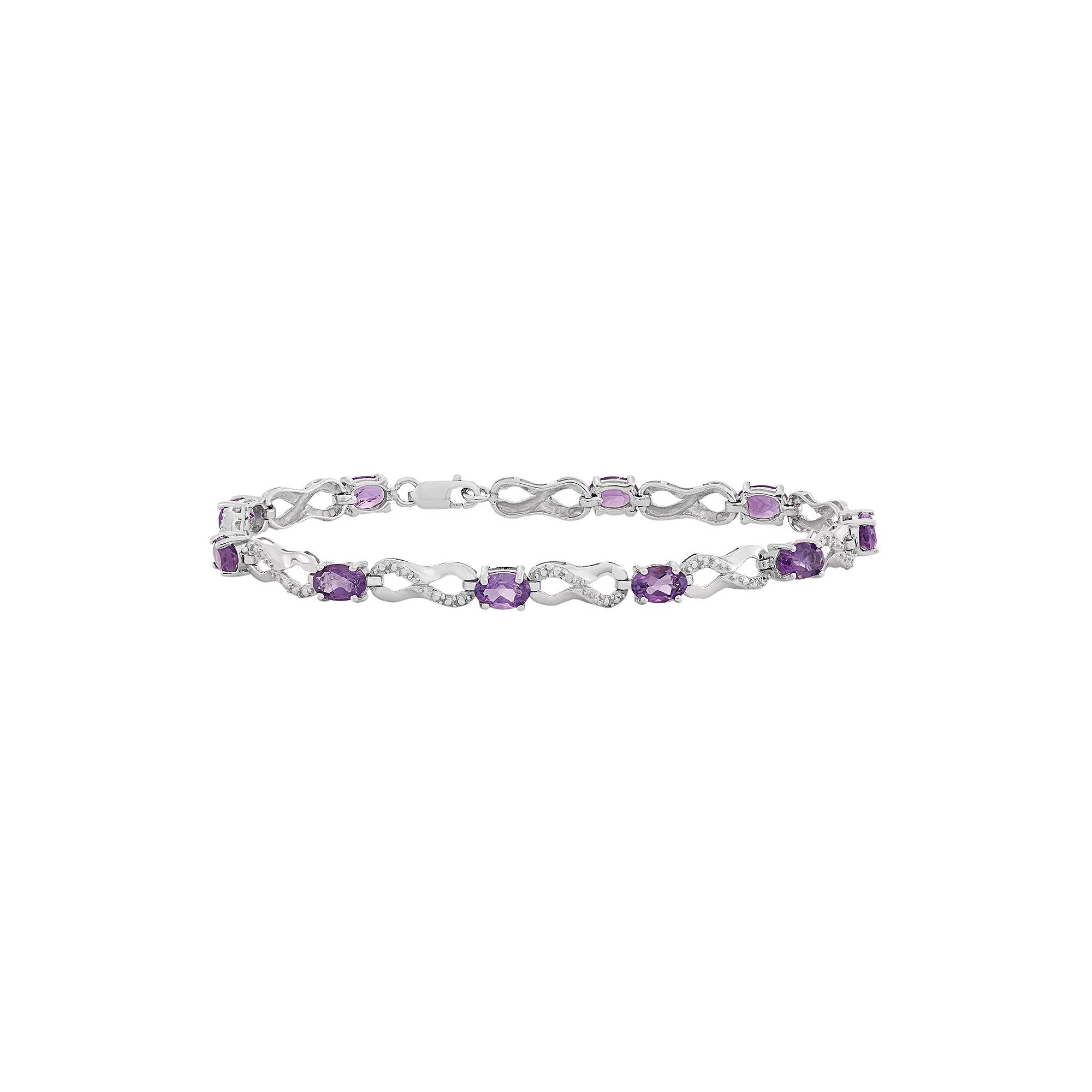 With alternating oval-cut genuine amethyst stones and infinity links with diamond accents, this sterling silver bracelet gives you unending beauty.BRACELET DETAILSLength: 7.25 in.Clasp: lobster-clawMetal: rhodium-plated sterling silverSTONE DETAILSStone type: genuine amethystShape: ovalSetting: prongDIAMOND DETAILSTotal weight: less than 1/10 ct.Shape: roundColor grade: I-JClarity: I2-I3Setting: prongImage(s) may be enlarged to show detail.Diamond weights are approximate. Diamond total weights may vary between .01 and .08 ct. Some diamonds have fewer than 17 facets.Gemstones may have been treated to enhance their appearance. Special care may be required. Please visit our Gemstone Treatment & Special Care Guide for more information. Size: 7.5". Color: Purple. Gender: female. Age Group: adult.