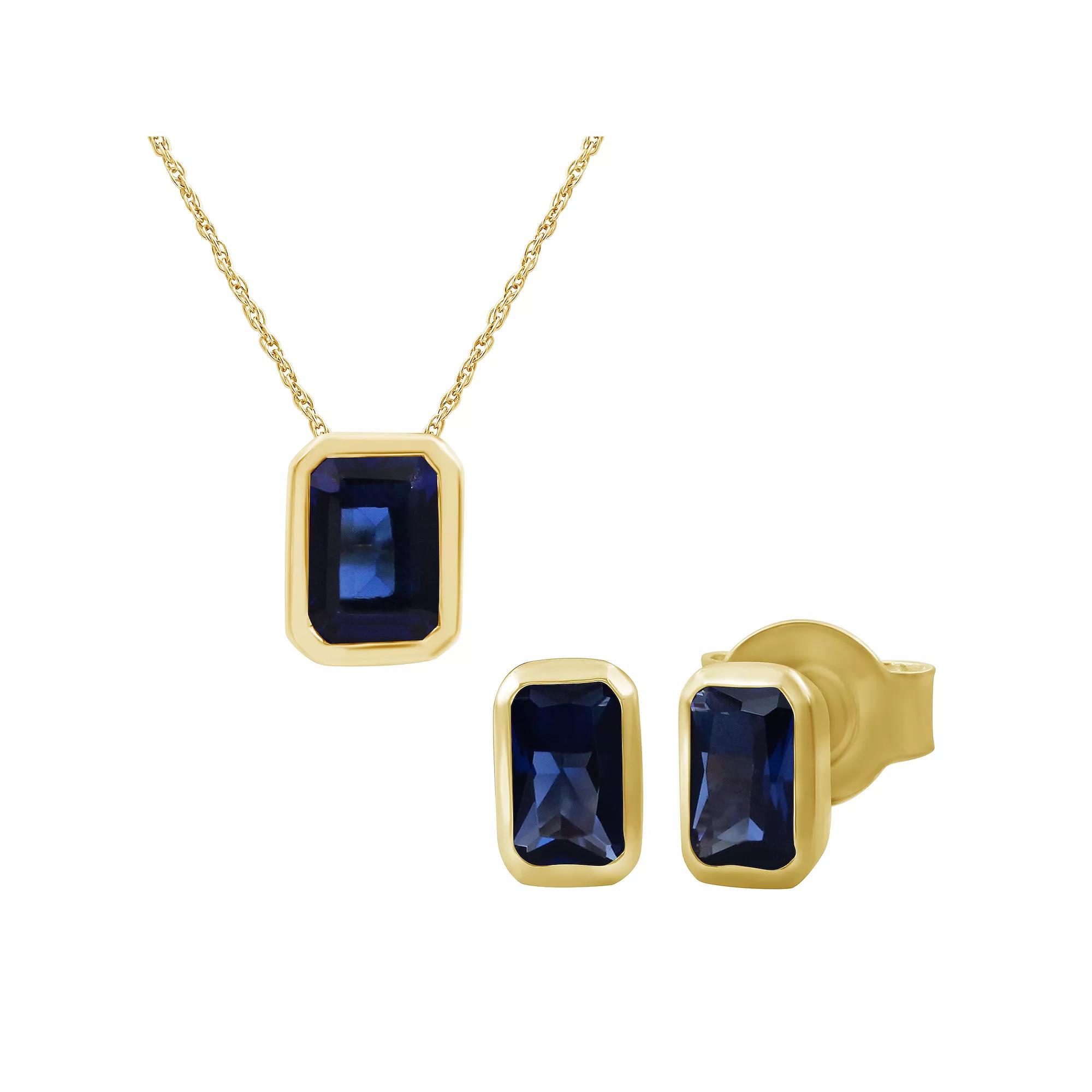 Elevate your style with this radiant lab-created gemstone necklace and earrings set from Jewelexcess. Click on this JEWELRY & WATCHES GUIDE to learn about fit, styles, materials and more! Elevate your style with this radiant lab-created gemstone necklace and earrings set from Jewelexcess. Click on this JEWELRY & WATCHES GUIDE to learn about fit, styles, materials and more! FEATURES Includes: 1 pendant necklace & 1 pair of earrings Drop length: 0.26-in. Chain length: 18-in. Chain type: cable Clasp: spring-ring Earring size: 6.80 mm x 4.80 mm Backings: post Nickel free Metal: sterling silver Plating: gold Finish: polishedSTONE DETAILS Stone type: lab-created emerald, lab-created ruby, lab-created sapphire Lab-created emerald & sapphire total weight: 1 1/2 ct. Lab-created ruby total weight: 2 ct. Necklace center stone size: 7 mm x 5 mm Earrings center stone size: 5 mm x 3 mm Shape: emerald cut Setting: bezel Gemstones may have been treated to enhance their appearance. Special care may be required. Please visit our Gemstone Treatment & Special Care Guide for more information. Size: 18". Gender: female. Age Group: adult. Material: Gold Over Sterling.