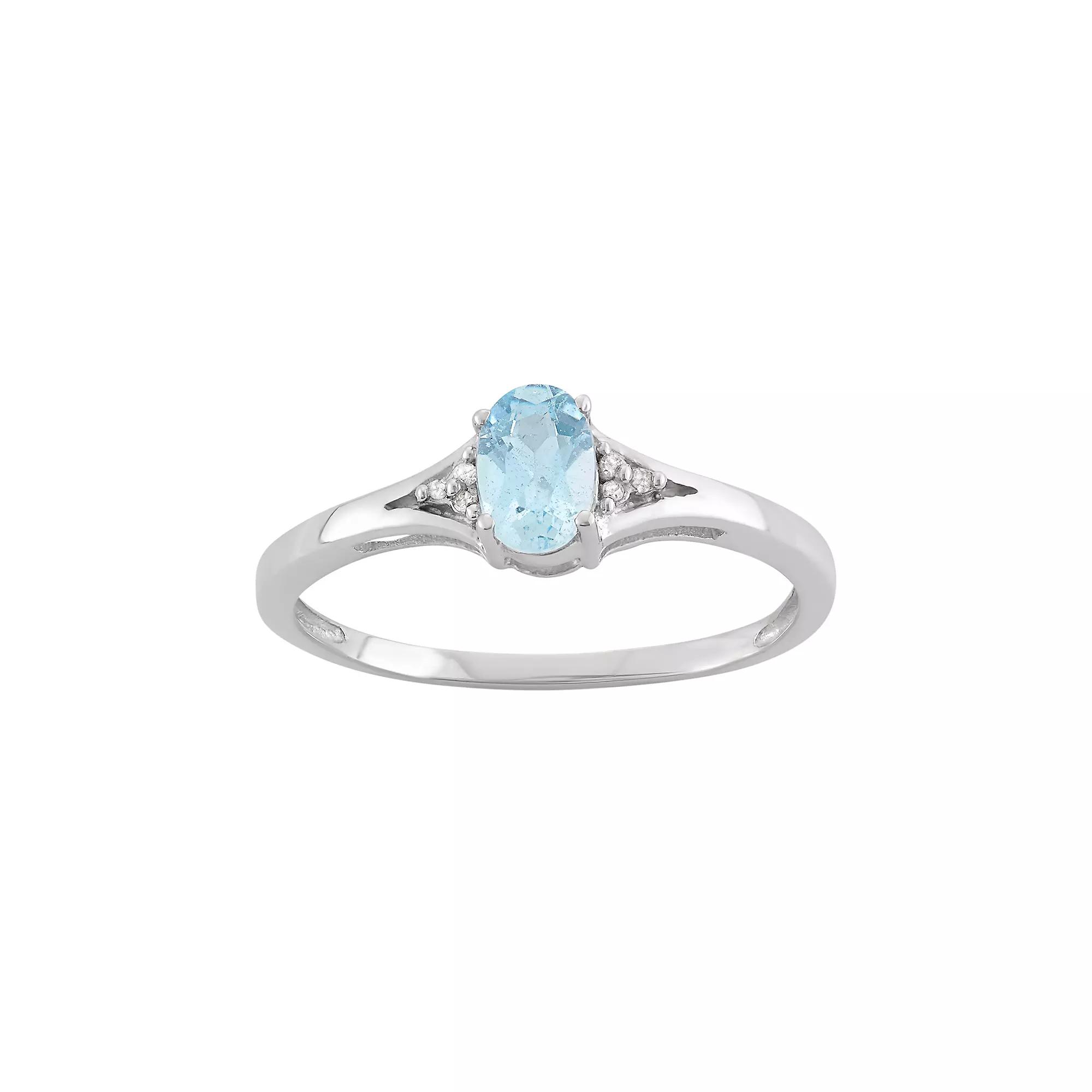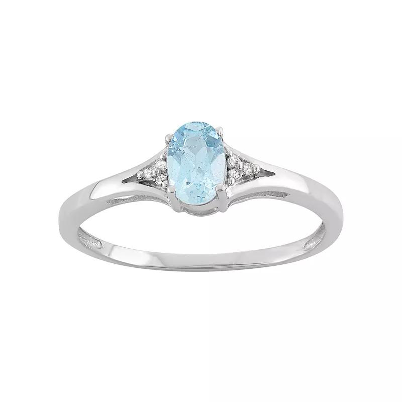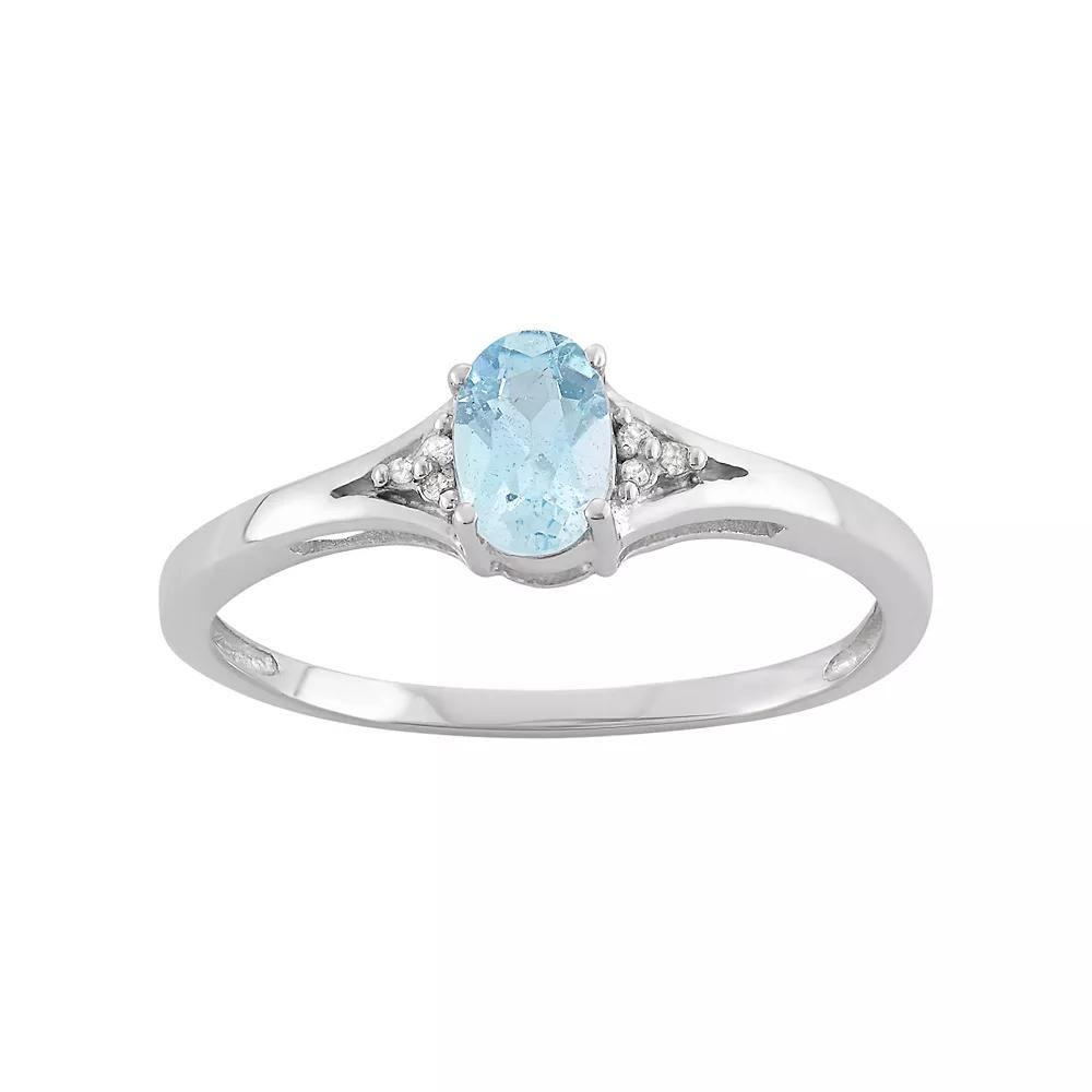 Add a touch of understated elegance to your look with this oval-cut genuine sky blue topaz and diamond accent ring.RING DETAILSWidth: 5.92 mmMetal: rhodium-plated sterling silverSTONE DETAILSStone type: genuine sky blue topazShape: ovalSetting: prongDIAMOND DETAILSTotal weight: less than 1/10 ct.Shape: roundColor grade: I-JClarity: I2-I3Setting: prongImage(s) may be enlarged to show detail.Diamond weights are approximate. Diamond total weights may vary between .01 and .08 ct. Some diamonds have fewer than 17 facets.Gemstones may have been treated to enhance their appearance. Special care may be required. Please visit our Gemstone Treatment & Special Care Guide for more information. Gender: female. Age Group: adult.