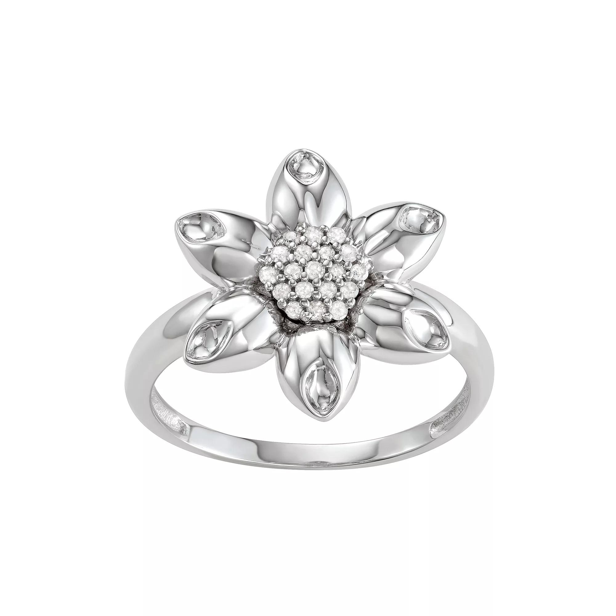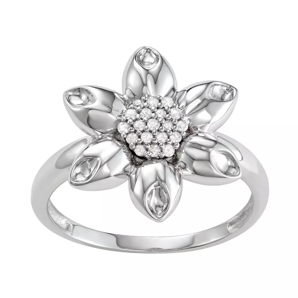 This sterling silver ring featuring a flower shape with 1/10 C.T. diamonds gives you a sparkling look.RING DETAILS Width: 16.10 mm. Metal: sterling silver Plating: rhodium Finish: polished DIAMOND DETAILS Total weight 1/10 c.t. Shape: round Color: white Color grade: H,I Clarity: I2,I3 Setting: prong Diamond weights are approximate. Diamond total weights may vary between .01 and .08 ct. Some diamonds have fewer than 17 facets.Diamond equivalent carat (ct.) Total Weight (T.W.) represents the approximate total weight of diamonds of equivalent appearance.Gemstones may have been treated to enhance their appearance. Special care may be required. Please visit our Gemstone Treatment & Special Care Guide for more information. Gender: female. Age Group: adult.
