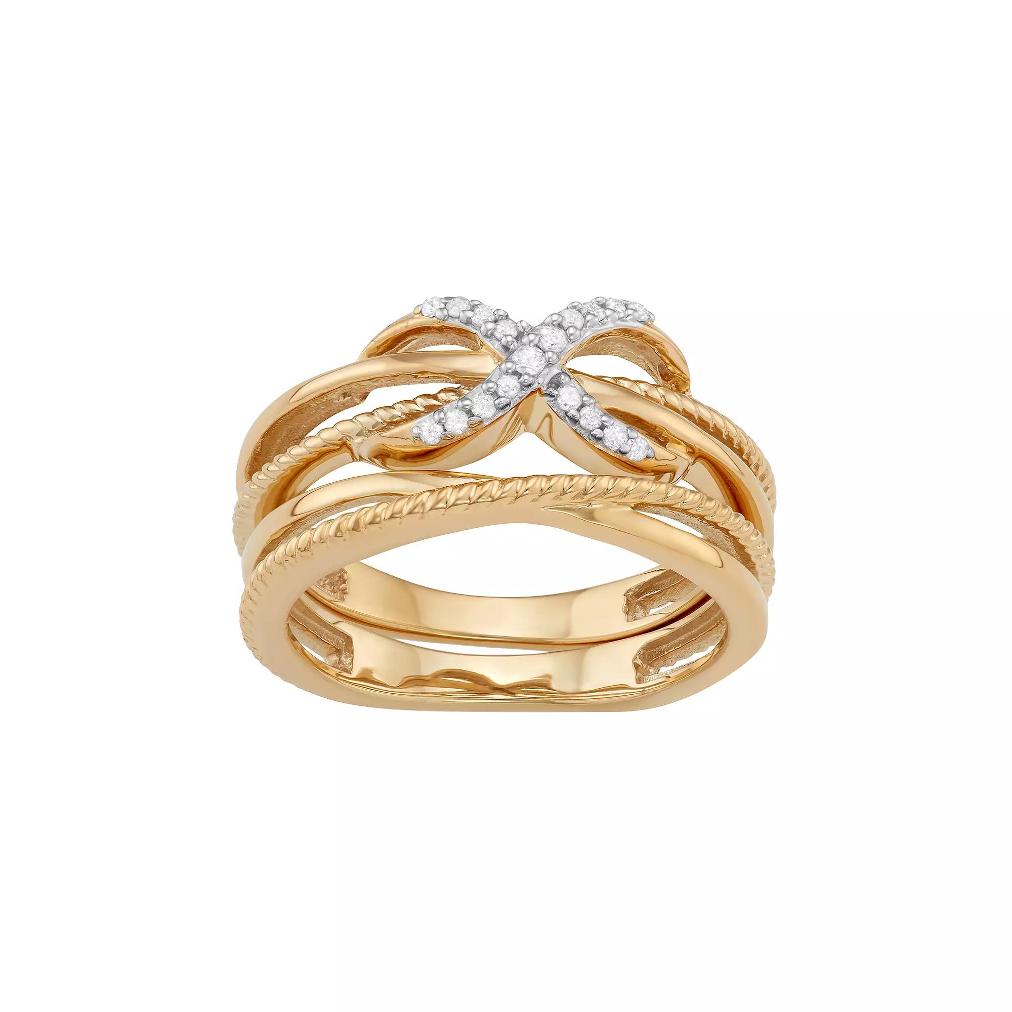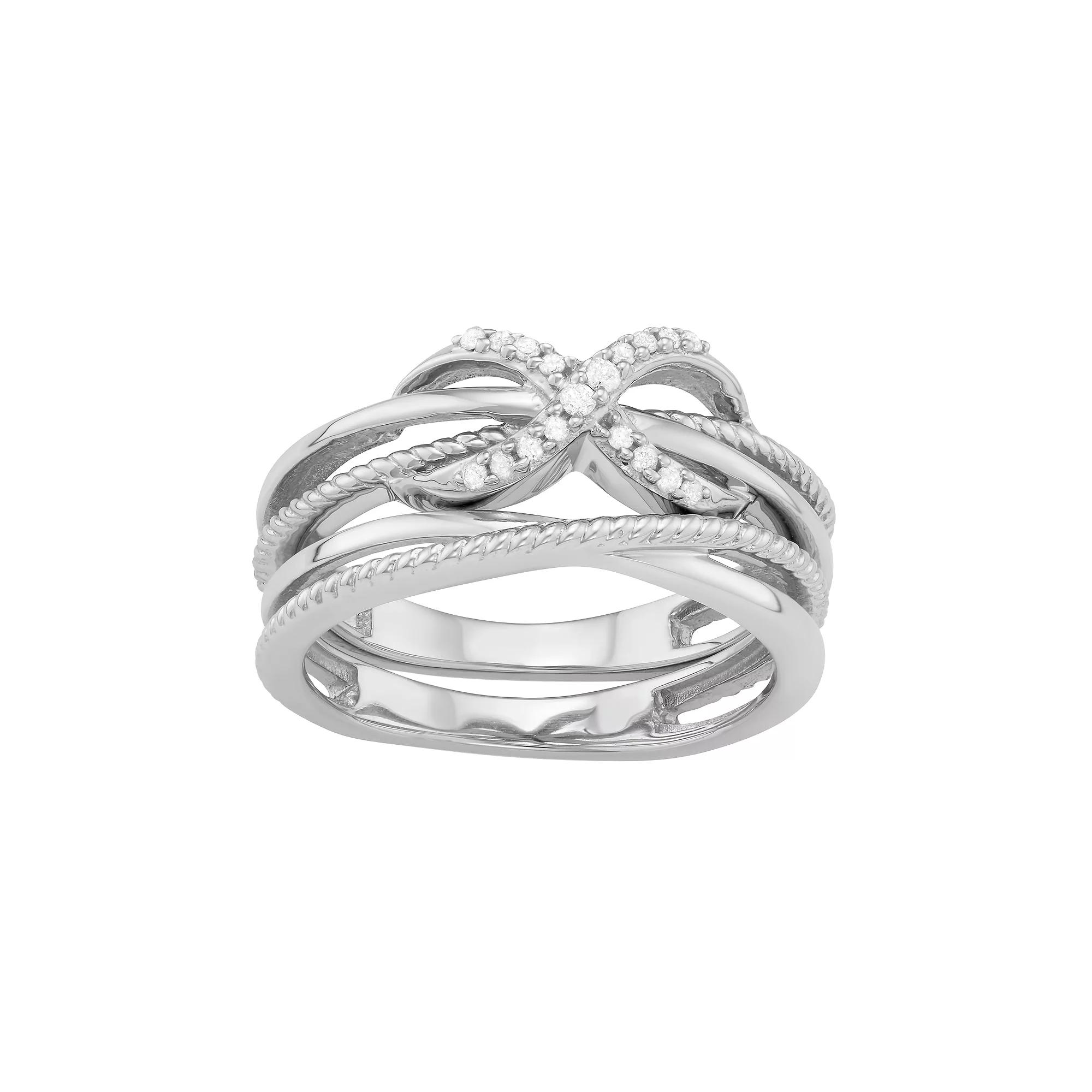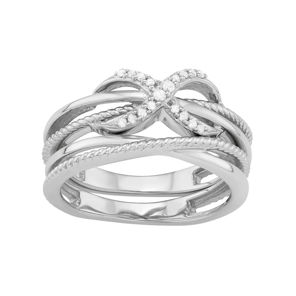 Elevate your look with the unending beauty of this diamond infinity ring set.SET DETAILSIncludes: 2 ringsTotal width: 0.71 in. Metal: sterling silverDIAMOND DETAILSTotal weight: 1/10 ct.Shape: single cutColor grade: I-JClarity: I2-I3Setting: paveGemstones may have been treated to enhance their appearance. Special care may be required. Please visit our Gemstone Treatment & Special Care Guide for more information.Image(s) may be enlarged to show detail.Diamond weights are approximate. Diamond total weights may vary between .01 and .08 ct. Some diamonds have fewer than 17 facets. Color: White. Gender: female. Age Group: adult.