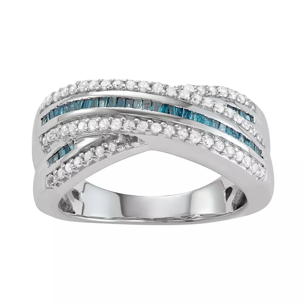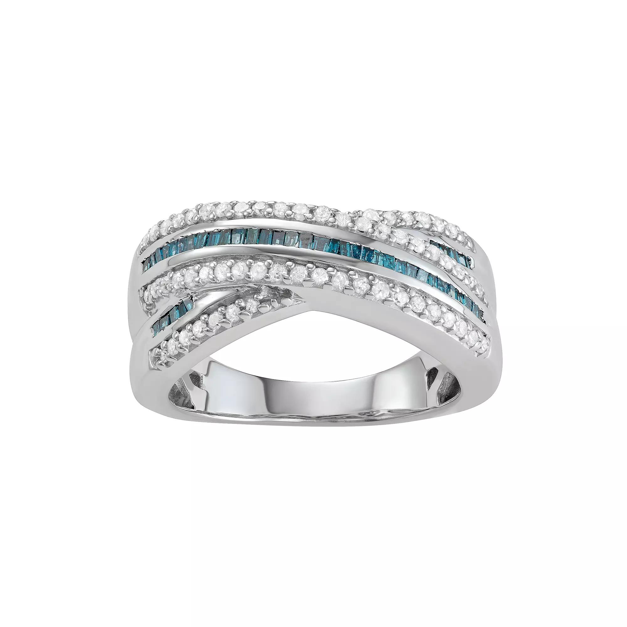 Sparkling style is effortless with this blue and white diamond ring. RING DETAILS Width: 8.70 mm Metal: sterling silver Plating: rhodium Finish: polished DIAMOND DETAILS Total weight: 1/2 c.t. Shape: baguette, round Color: blue & white Color grade: H,I Clarity: I2,I3 Setting: channel, prong Diamond weights are approximate. Diamond total weights may vary between .01 and .08 ct. Some diamonds have fewer than 17 facets.Diamond equivalent carat (ct.) Total Weight (T.W.) represents the approximate total weight of diamonds of equivalent appearance.Gemstones may have been treated to enhance their appearance. Special care may be required. Please visit our Gemstone Treatment & Special Care Guide for more information. Size: 6. Gender: female. Age Group: adult.