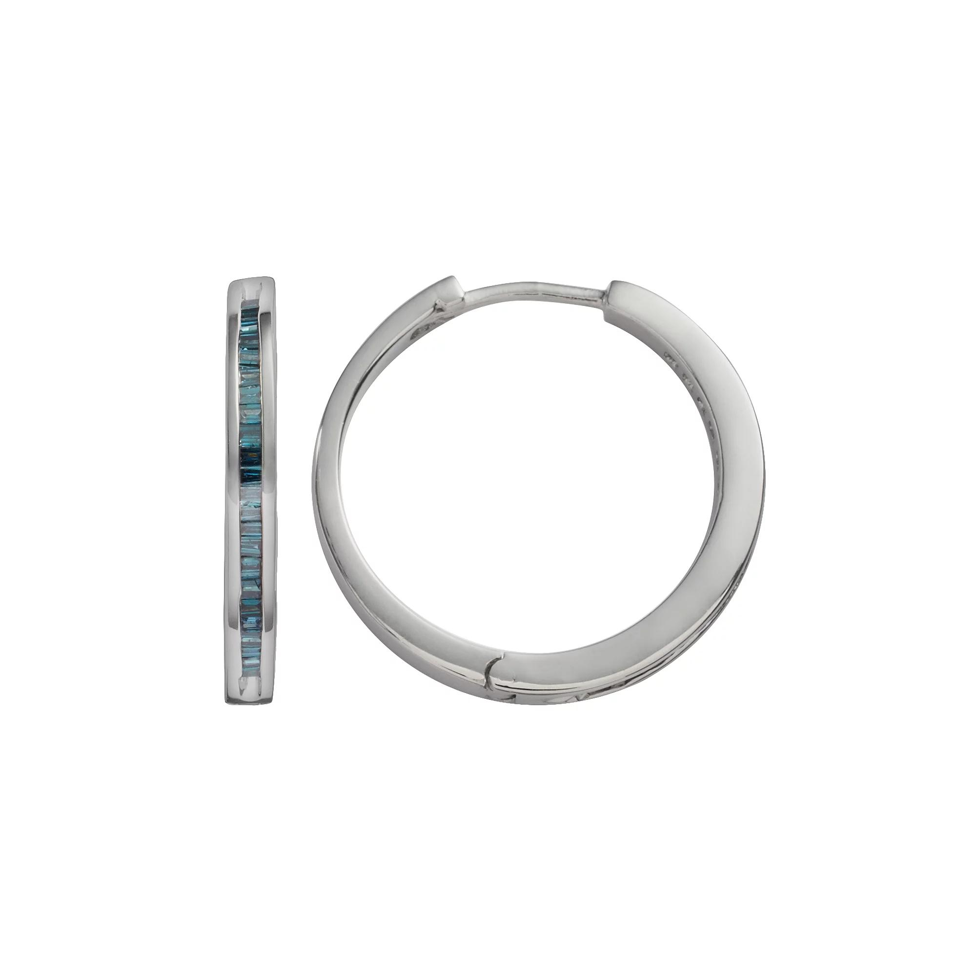 Elevate any look with these blue diamond earrings.Earring Details: Diameter: .81-in. Backings: click-it Metal: rhodium-plated sterling silverDiamond Details: Carat total weight: 1/2 Cut: baguette Color: blue Setting: channelImage(s) may be enlarged to show detail.Diamond weights are approximate. Diamond total weights may vary between .01 and .08 ct. Some diamonds have fewer than 17 facets.Gemstones may have been treated to enhance their appearance. Special care may be required. Please visit our Gemstone Treatment & Special Care Guide for more information. Size: One Size. Gender: female. Age Group: adult.
