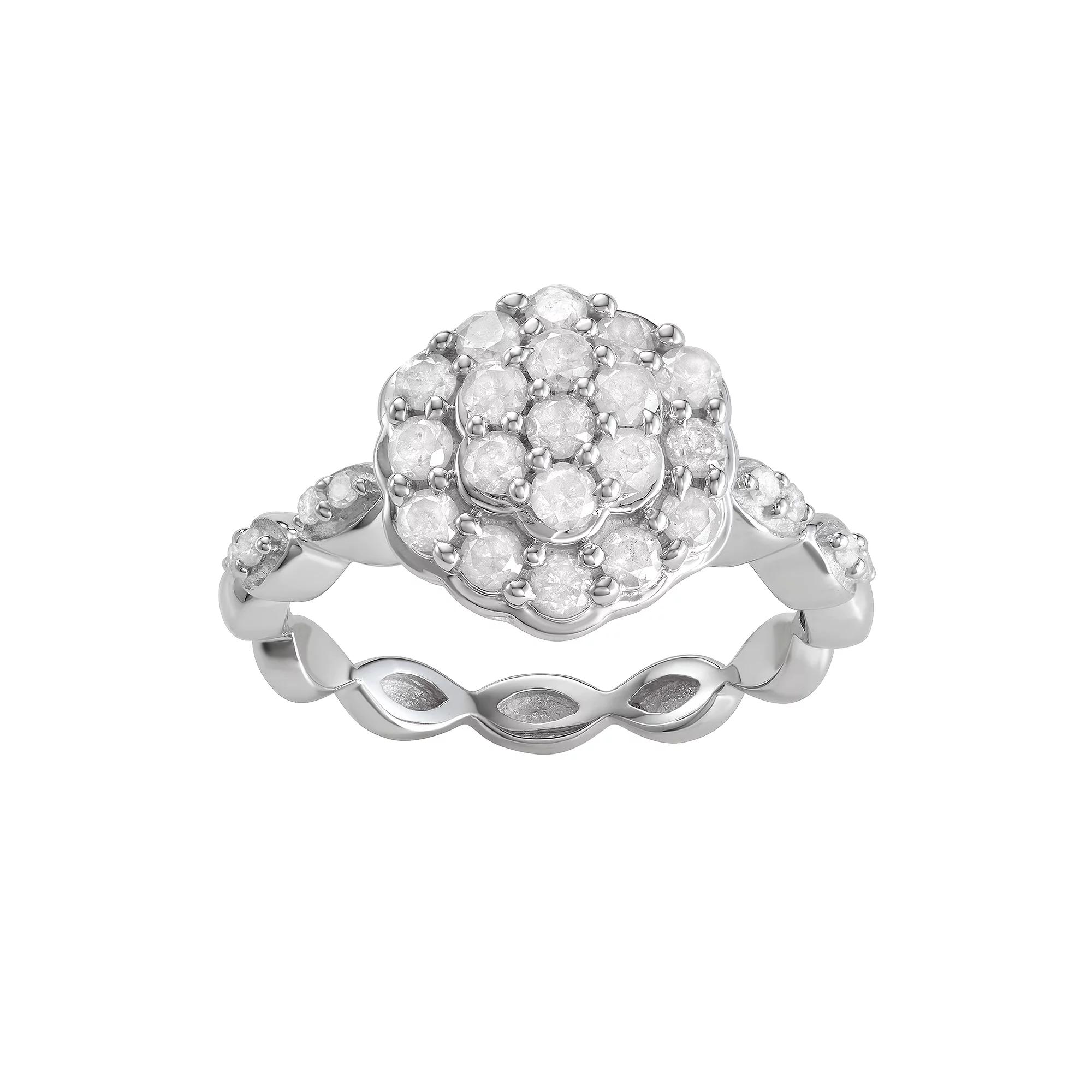 A unique shape and design gives this 1 C.T. diamond ring a sparkling look. RING DETAILS Width: 12.10 mm Size: 7 Metal: sterling silver Plating: rhodium Finish: polished DIAMOND DETAILS Total weight: 1 ct. Shape: round Color: white Color grade: H,I Clarity: I2,I3 Setting: prong Diamond weights are approximate. Diamond total weights may vary between .01 and .08 ct. Some diamonds have fewer than 17 facets.Diamond equivalent carat (ct.) Total Weight (T.W.) represents the approximate total weight of diamonds of equivalent appearance.Gemstones may have been treated to enhance their appearance. Special care may be required. Please visit our Gemstone Treatment & Special Care Guide for more information. Gender: female. Age Group: adult.