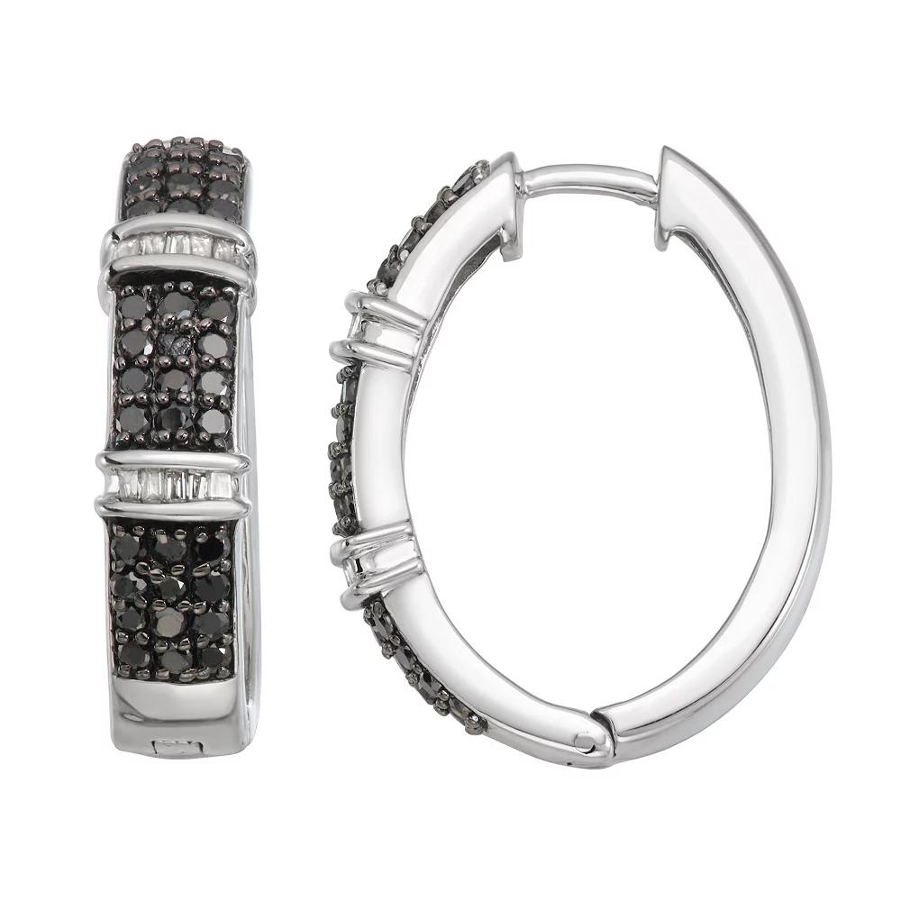 These gorgeous sterling silver black and white diamond hoop earrings are the perfect way to finish any outfit. These gorgeous sterling silver black and white diamond hoop earrings are the perfect way to finish any outfit. Length: 23.6 mm Metal: sterling silver Plating: rhodium Finish: polishedDIAMOND DETAILS Total weight: 1 ct. Shape: round Setting: pave Diamond weights are approximate. Diamond total weights may vary between .01 and .08 ct. Some diamonds have fewer than 17 facets. Gemstones may have been treated to enhance their appearance. Special care may be required. Please visit our Gemstone Treatment & Special Care Guide for more information. Image(s) may be enlarged to show detail. Please note, due to the high value of this item, a signature may be required upon delivery. Size: One Size. Gender: female. Age Group: adult.