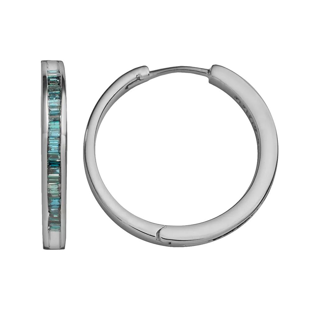 Elevate any look with these blue diamond earrings.Earring Details: Diameter: .88-in. Backings: click-it Metal: rhodium-plated sterling silverDiamond Details: Carat total weight: 1 Cut: baguette Color: blue Setting: channelImage(s) may be enlarged to show detail.Diamond weights are approximate. Diamond total weights may vary between .01 and .08 ct. Some diamonds have fewer than 17 facets.Please note, due to the high value of this item, a signature may be required upon delivery.Gemstones may have been treated to enhance their appearance. Special care may be required. Please visit our Gemstone Treatment & Special Care Guide for more information. Size: One Size. Gender: female. Age Group: adult.
