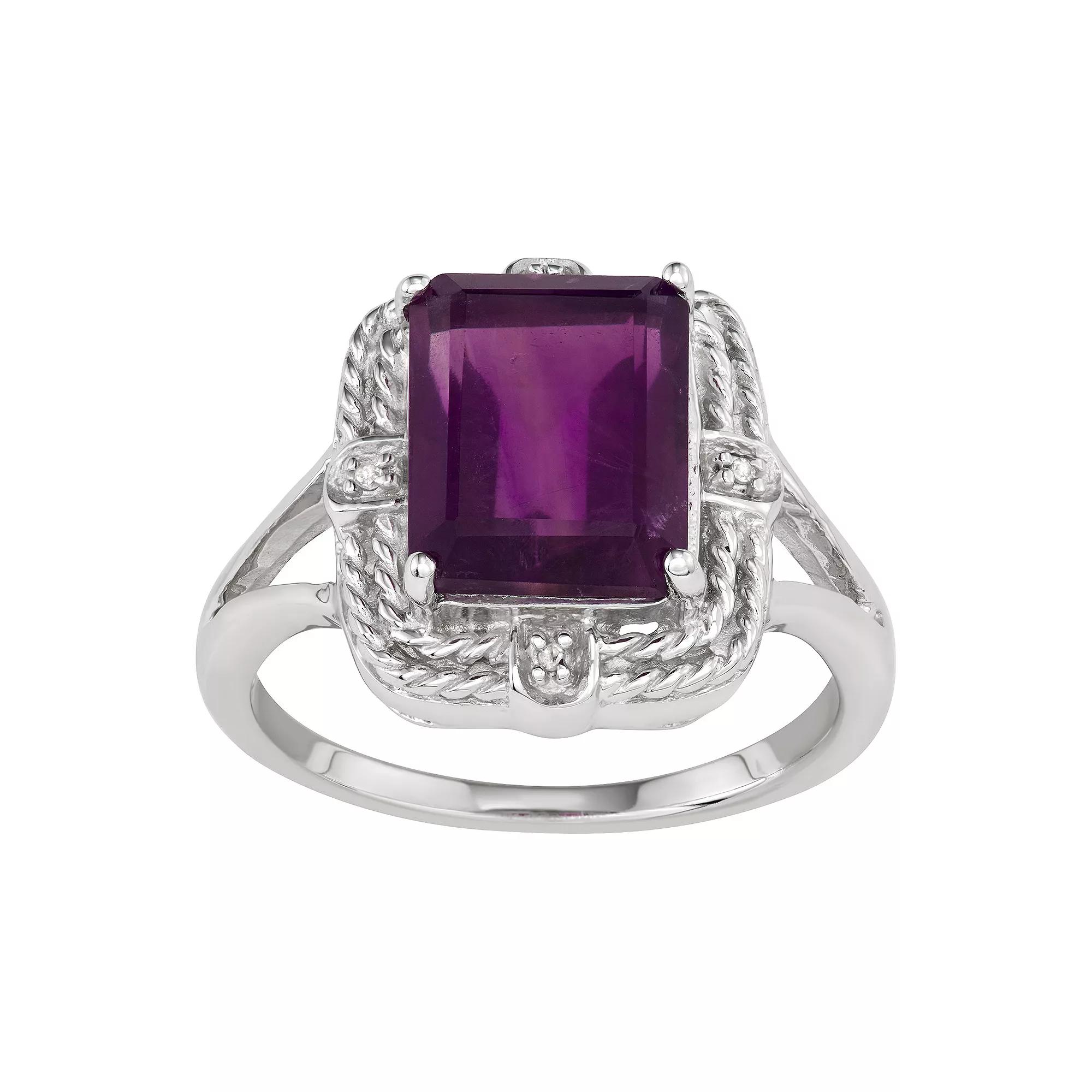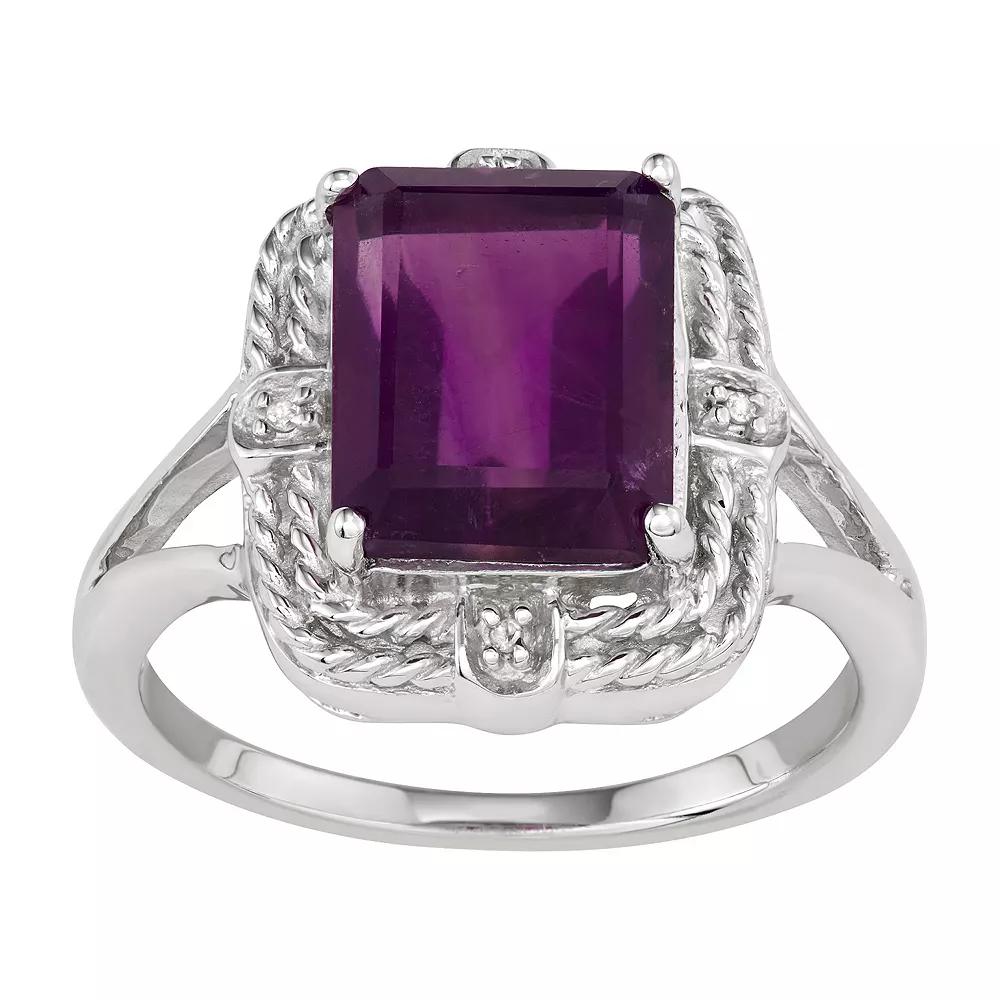 Adorned with an emerald-cut amethyst and diamond accents, this sterling silver ring accentuates your look beautifully. Adorned with an emerald-cut amethyst and diamond accents, this sterling silver ring accentuates your look beautifully. Width: 15 mm Metal: sterling silver Finish: polishedSTONE DETAILS Stone type: amethyst Total weight: 3 3/8 ct. Center stone size: 10 mm x 8 mm Shape: emerald cut Setting: prongDIAMOND DETAILS Total weight: less than 1/10 ct. Shape: round Setting: pave Gemstones may have been treated to enhance their appearance. Special care may be required. Please visit our Gemstone Treatment & Special Care Guide for more information. Diamond weights are approximate. Diamond total weights may vary between .01 and .08 ct. Some diamonds have fewer than 17 facets. Image(s) may be enlarged to show detail. Please note, due to the high value of this item, a signature may be required upon delivery. Size: 6. Color: Purple. Gender: female. Age Group: adult.