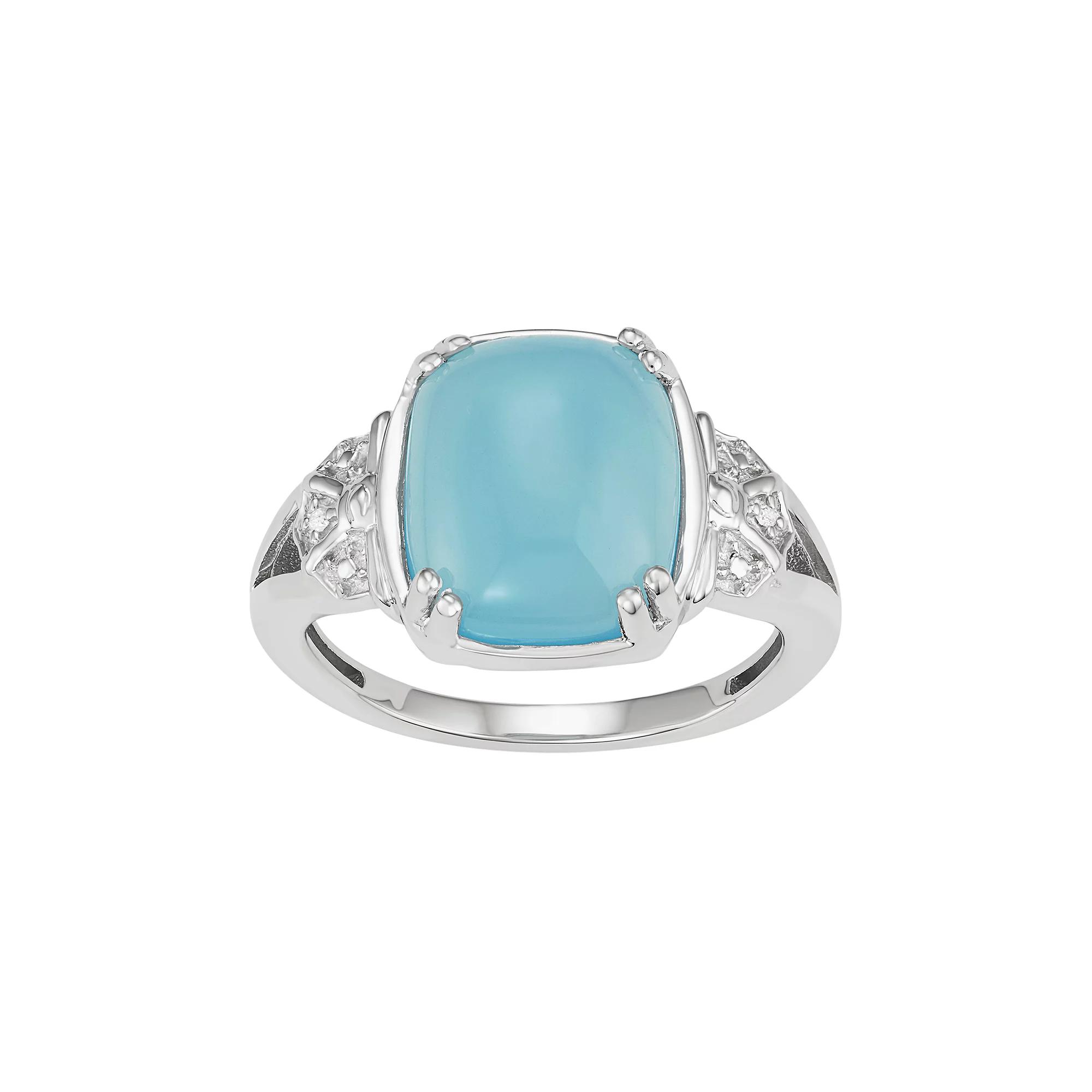 Showcase your bold sense of style when you add this blue chalcedony cabochon and diamond accent ring to your ensemble.RING DETAILSWidth: .53 in. Metal: sterling silverPlating: rhodiumSTONE DETAILSStone type: blue chalcedonyTotal weight: 5 ct.Center stone size: 12 mm x 10 mmShape: cushion cabochonSetting: prongDIAMOND DETAILSTotal weight: less than 1/10 ct.Shape: roundSetting: prongGemstones may have been treated to enhance their appearance. Special care may be required. Please visit our Gemstone Treatment & Special Care Guide for more information.Image(s) may be enlarged to show detail.Diamond weights are approximate. Diamond total weights may vary between .01 and .08 ct. Some diamonds have fewer than 17 facets. Gender: female. Age Group: adult. Material: Sterling Silver Rhodium.