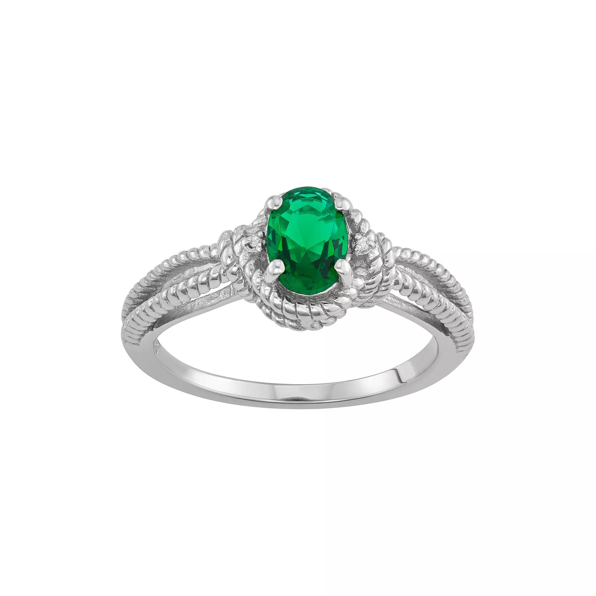 A lovely, lab-created emerald stone and diamond accents make this sterling silver ring a beautiful accessory. A lovely, lab-created emerald stone and diamond accents make this sterling silver ring a beautiful accessory. RING DETAILS Width: 0.35 mm Metal: sterling silver Finish: polished STONE DETAILS Total weight: 1/2 ct. Center stone: 7 mm. x 5 mm. Stones: lab-created emerald & diamond accents Shape: oval Setting: prong Gift Givers: This item ships in its original packaging. If intended as a gift, the packaging may reveal the contents. Diamond equivalent carat (ct.) Total Weight (T.W.) represents the approximate total weight of diamonds of equivalent appearance. Diamond weights are approximate. Diamond total weights may vary between .01 and .08 ct. Some diamonds have fewer than 17 facets. Gemstones may have been treated to enhance their appearance. Special care may be required. Please visit our Gemstone Treatment & Special Care Guide for more information. Please note, due to the high value of this item, a signature may be required upon delivery. Color: Green. Gender: female. Age Group: adult.