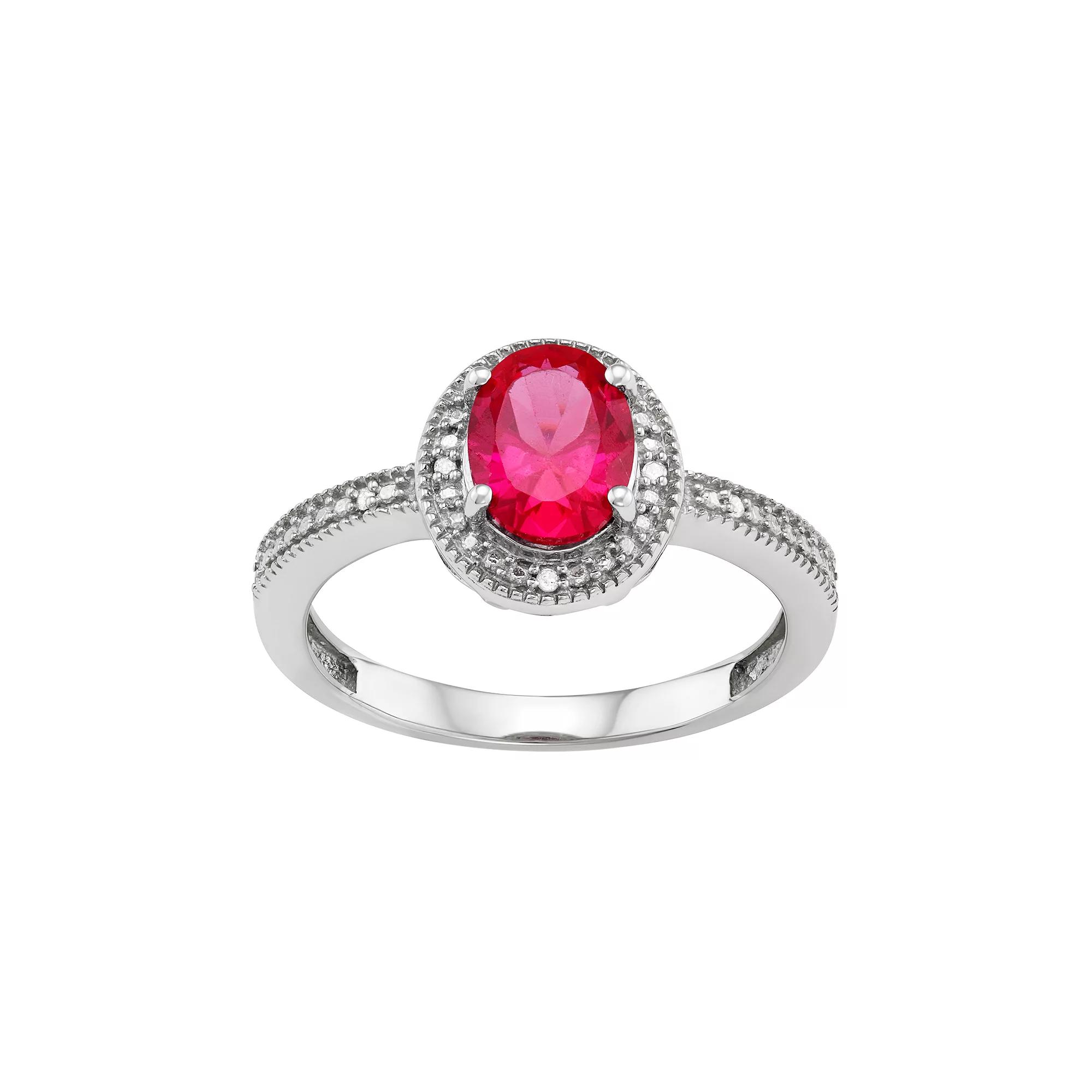 Timeless style abounds with this enchanting lab-created ruby and diamond accent halo ring.RING DETAILSWidth: 0.43 in. Metal: sterling silverPlating: rhodiumSTONE DETAILSStone type: lab-created rubyTotal weight: 1 3/8 ct.Shape: ovalSetting: prongDIAMOND DETAILSTotal weight: less than 1/10 ct.Shape: single cutColor grade: I-JClarity: I2-I3Setting: paveGemstones may have been treated to enhance their appearance. Special care may be required. Please visit our Gemstone Treatment & Special Care Guide for more information.Image(s) may be enlarged to show detail.Diamond weights are approximate. Diamond total weights may vary between .01 and .08 ct. Some diamonds have fewer than 17 facets. Color: White. Gender: female. Age Group: adult.