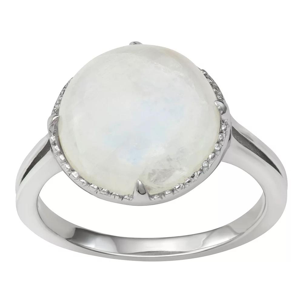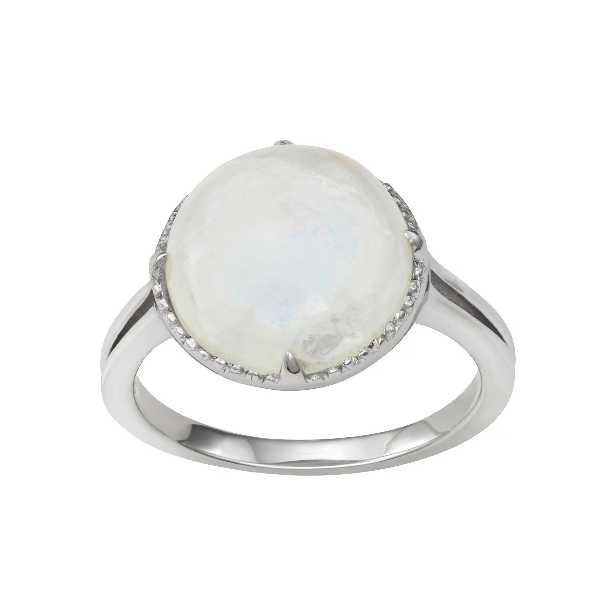 Adorned with a luminous moonstone cabochon, this sterling silver ring is sure to captivate. Adorned with a luminous moonstone cabochon, this sterling silver ring is sure to captivate. Metal: sterling silver Plating: rhodium Width: 1.86 mm Finish: polishedSTONE DETAILS Stone type: moonstone Total weight: 6 ct. Center stone size: 12 mm x 12 mm Shape: round cabochon Setting: prong Gemstones may have been treated to enhance their appearance. Special care may be required. Please visit our Gemstone Treatment & Special Care Guide for more information. Please note, due to the high value of this item, a signature may be required upon delivery. Color: White. Gender: female. Age Group: adult.