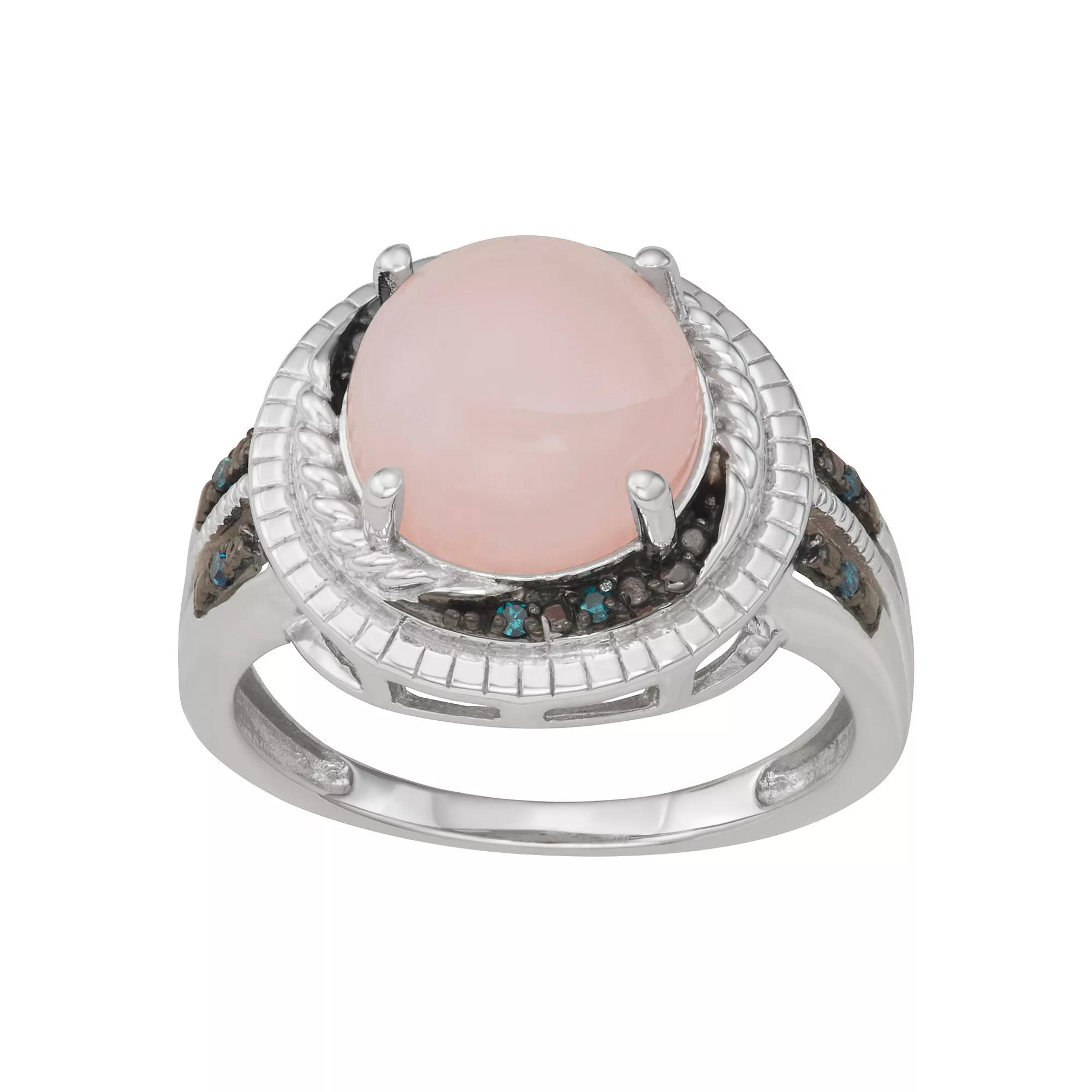 You're sure to love the distinctive style of this pink opal and blue diamond ring. You're sure to love the distinctive style of this pink opal and blue diamond ring. Metal: sterling silver Plating: rhodium Width: 2.00 mm Finish: polishedSTONE DETAILS Stone type: pink opal Total weight: 3 1/2 ct. Center stone size: 10 mm x 10 mm Shape: round cabochon Setting: prongDIAMOND DETAILS Total weight: less than 1/10 ct. Color: blue Setting: pave Shape: round cabochon Diamond weights are approximate. Diamond Total Weights may vary between .01 and .13 ct. Some diamonds consist of fewer than 17 facets. Gemstones may have been treated to enhance their appearance. Special care may be required. Please visit our Gemstone Treatment & Special Care Guide for more information. Please note, due to the high value of this item, a signature may be required upon delivery. Color: White. Gender: female. Age Group: adult.