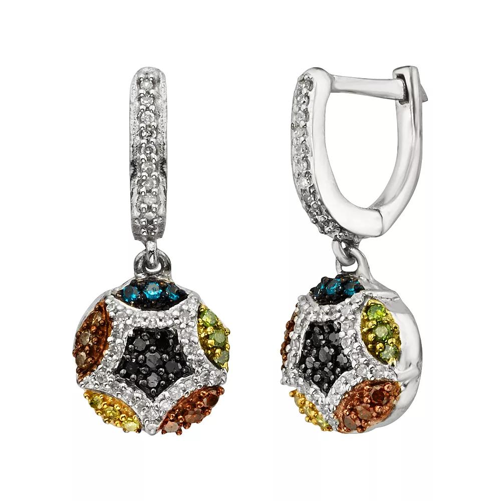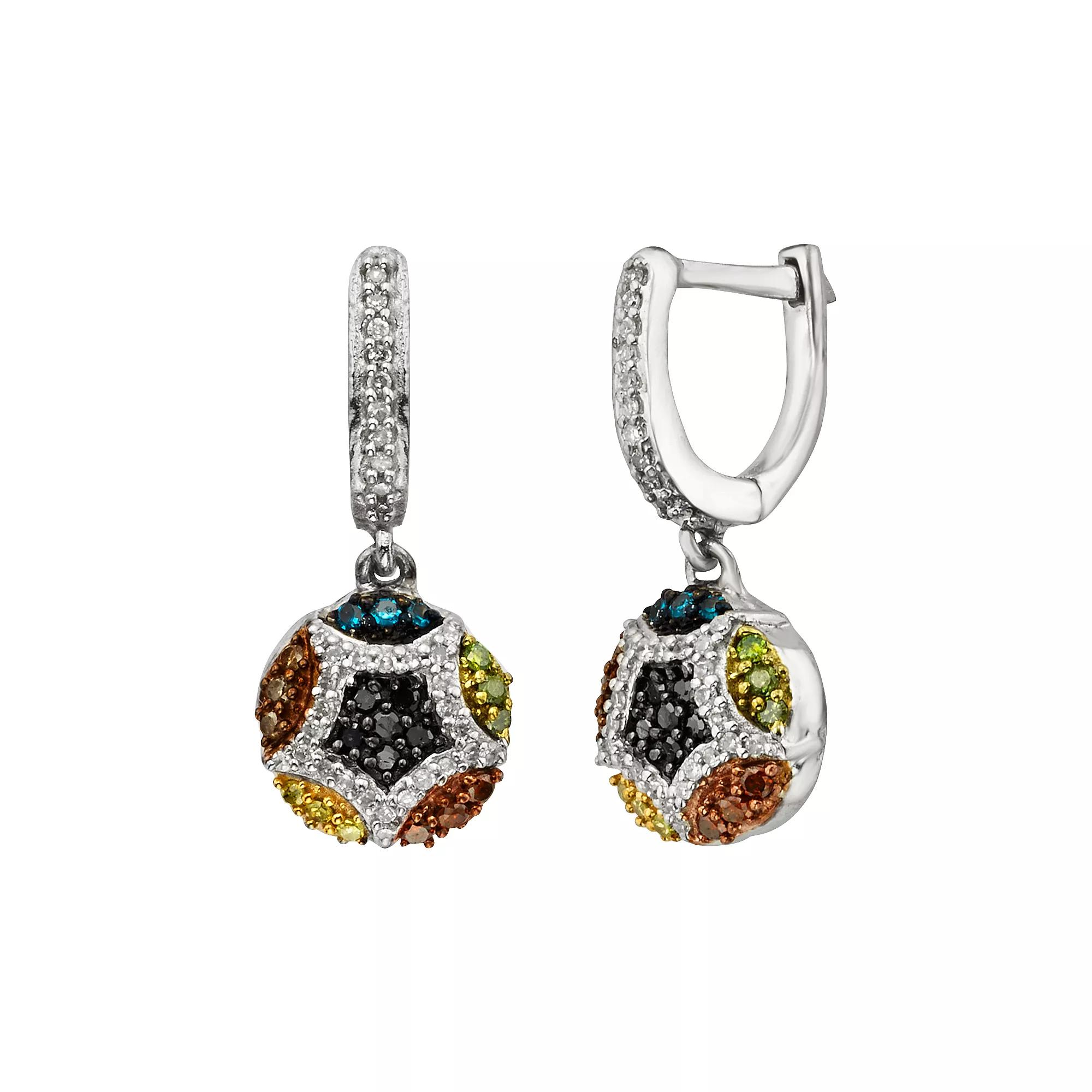 Clustered diamonds in seven different hues make these drop earrings an eye-catching pair.Earring Details: Length: .9 in. Closures: leverback Metal: black, blue, orange, yellow, rose, green & white rhodium-plated sterling silverDiamond Details: Total weight: 1/2 ct. Cut: round Color: black, blue, champagne, yellow, red, green, white Clarity: I2-I3 Setting: prongImage(s) may be enlarged to show detail.Diamond weights are approximate. Diamond total weights may vary between .01 and .08 ct. Some diamonds have fewer than 17 facets.Gemstones may have been treated to enhance their appearance. Special care may be required. Please visit our Gemstone Treatment & Special Care Guide for more information. Size: One Size. Color: Multicolor. Gender: female. Age Group: adult.