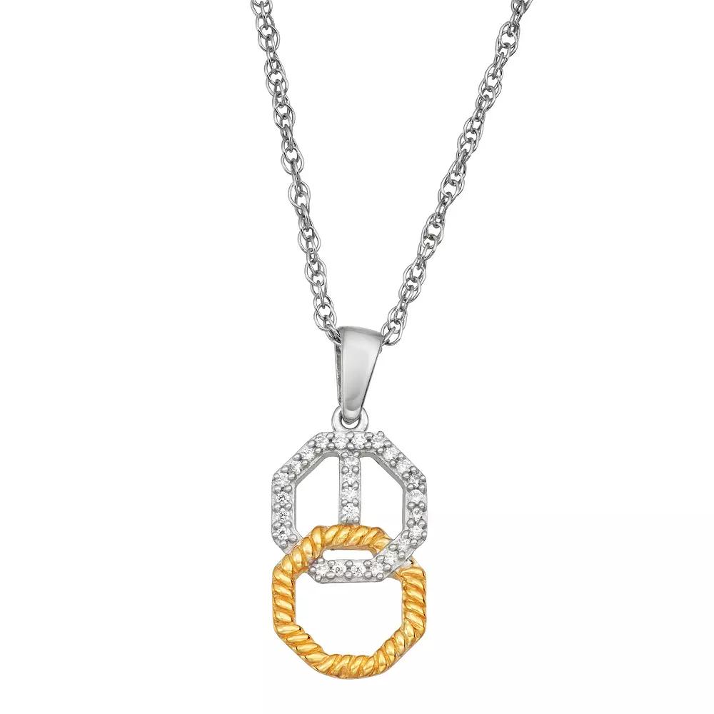 This gorgeous two tone sterling silver diamond interlocked pendant necklace is the perfect way to finish any outfit. This gorgeous two tone sterling silver diamond interlocked pendant necklace is the perfect way to finish any outfit. Pendant size: 0.76"L x 0.28"W Chain type: rope Clasp: spring-ring Metal: sterling silver Plating: 14k gold Finish: polishedDIAMOND DETAILS Total weight: 1/10 ct. Shape: round Setting: pave Diamond weights are approximate. Diamond total weights may vary between .01 and .08 ct. Some diamonds have fewer than 17 facets. Gemstones may have been treated to enhance their appearance. Special care may be required. Please visit our Gemstone Treatment & Special Care Guide for more information. Image(s) may be enlarged to show detail. Please note, due to the high value of this item, a signature may be required upon delivery. Size: 18". Color: Multicolor. Gender: female. Age Group: adult. Material: Gold Over Sterling.