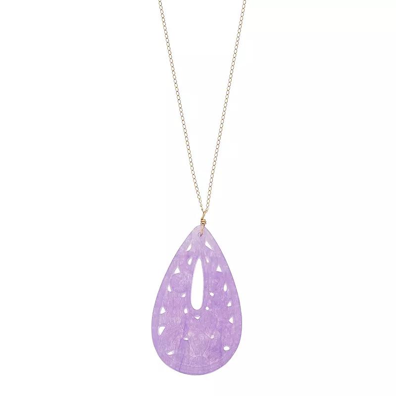 This 14k gold necklace offers a unique accent to your look. It features a carved lavender agate pendant that is sure to turn heads. This 14k gold necklace offers a unique accent to your look. It features a carved lavender agate pendant that is sure to turn heads. Metal: 14k gold Chain length: 18 in. Packaging: boxed Finish: polished Pendant size: 2"L x 1"W Chain type: cableSTONE DETAILS Stone type: lavender agate Stone size: 2"L x 1"W Shape: carved Gemstones may have been treated to enhance their appearance. Special care may be required. Please visit our Gemstone Treatment & Special Care Guide for more information. Please note, due to the high value of this item, a signature may be required upon delivery. Size: 17". Color: Purple. Gender: female. Age Group: adult.