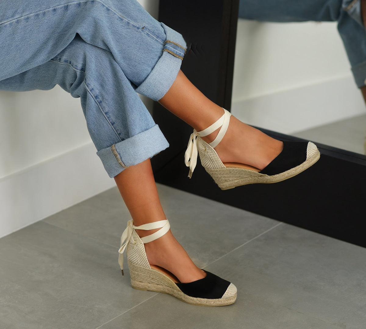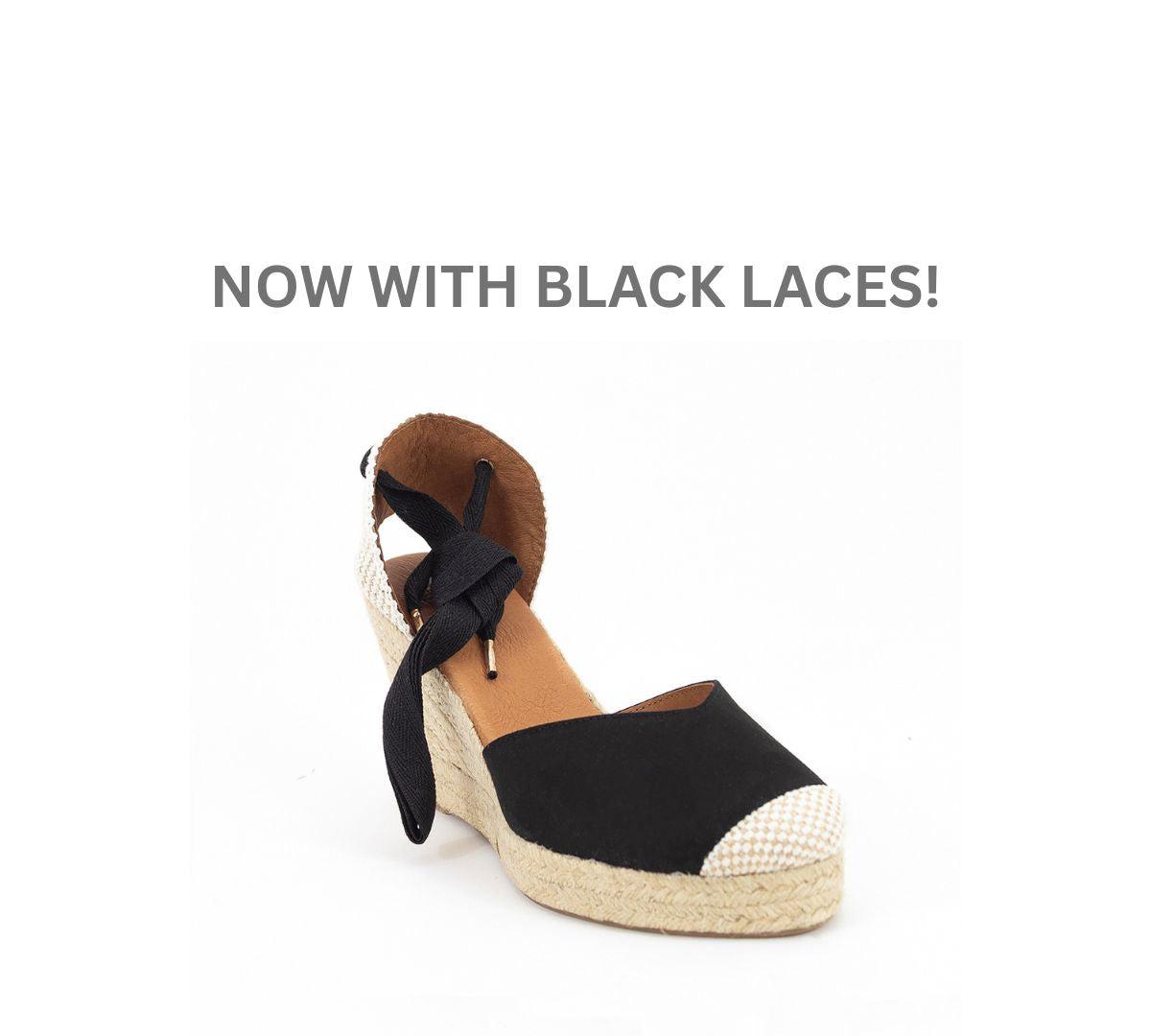 - Classic 3.5” Wedge 1” platform - Biodegradable jute used to wrap the sole.- Ties at ankle with laces, off white or black.- Suede leather- leather linning/upper - Made in Spain