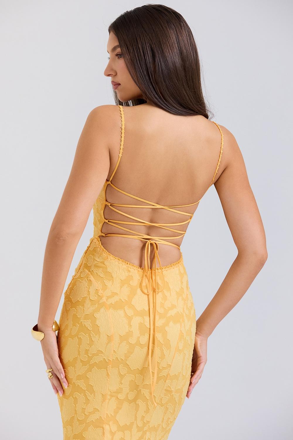 Cut from a delicate burnout lace, 'Joan' is a romantic dream and an ode to femininity. The dainty trim to the neckline and straps turn to an open back with delicate satin ties to customise the fit. Skimming over your figure, 'Joan' falls to a floor sweeping maxi length that opens out to a glamorous godet skirt to beautifully elevate this gorgeous creation.