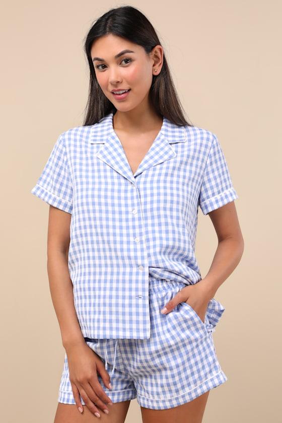 Your dreams are about to be extra sweet thanks to this two-piece pajama set, featuring a classic gingham pattern that makes things all the more adorable. Lightweight woven fabric shapes a short-sleeved top with a collared neckline and a relaxed, button-front bodice, while the matching shorts boast an elasticized drawstring waistband for an ultra-comfy fit.