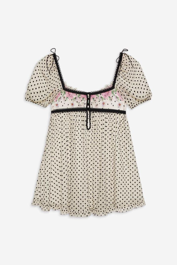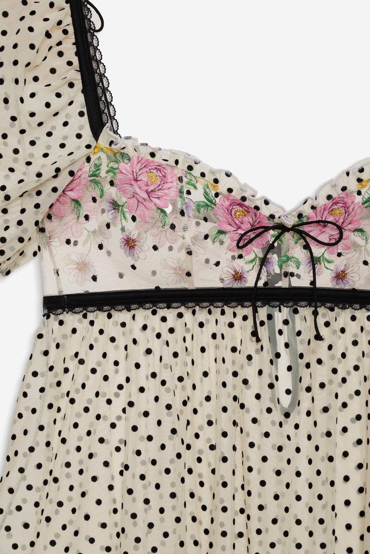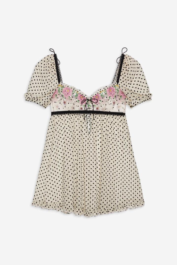 Designed for the ethereal Muse, the Joannie pink slip dress is embroidered with beautiful blooms and contrast polka dots. This floral slip dress spotlights elegant puff sleeves and a gathered skirt.