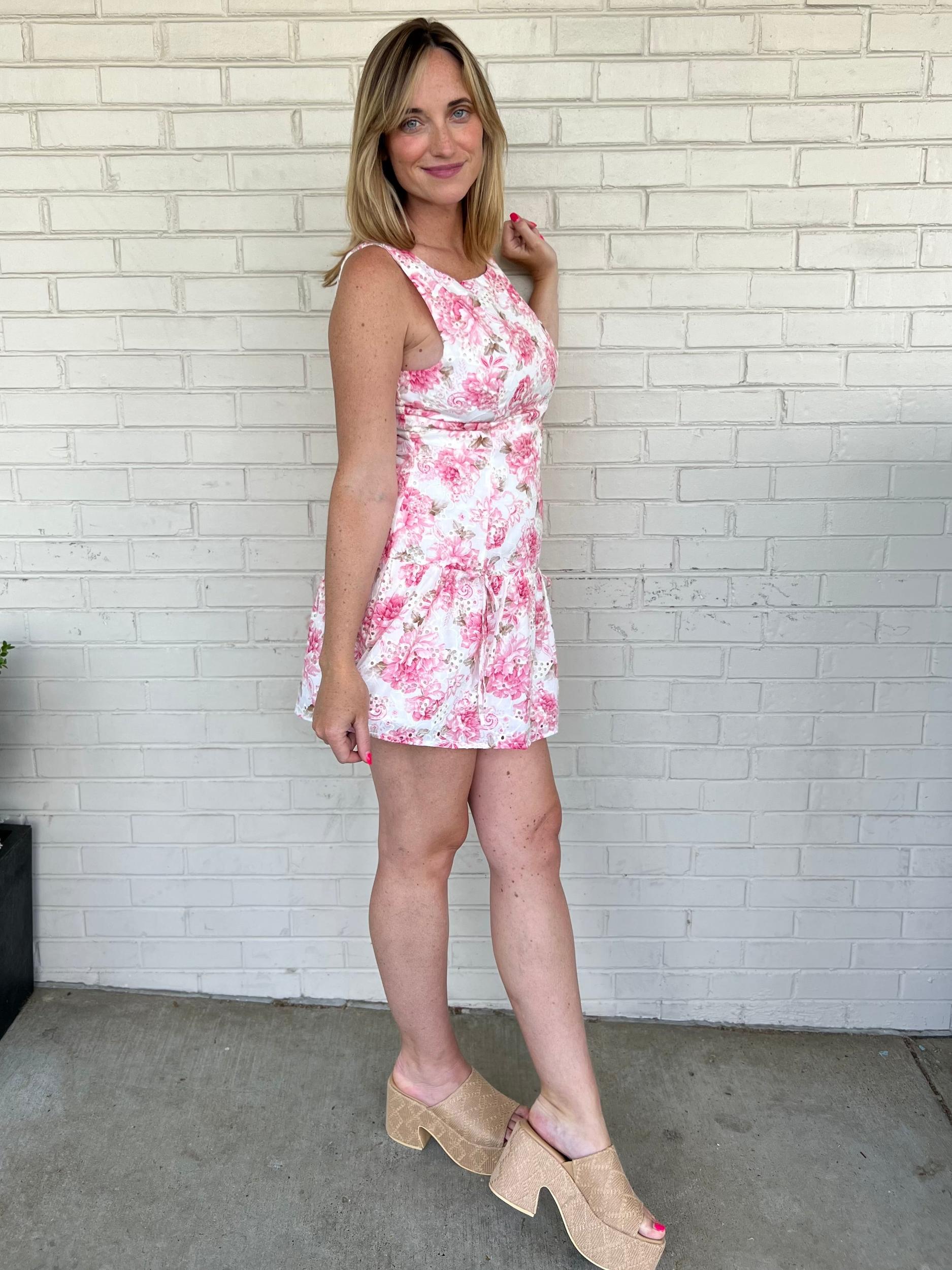 Get ready to turn heads in the Jodi Dress! This pretty pink and white floral lace dress screams fun with its sleeveless, high neck design and flirty ruffle skirt. The drop waist and two cute bow accents add a playful touch. And don't worry about getting in and out of this dress, the back has a convenient discreet zipper.