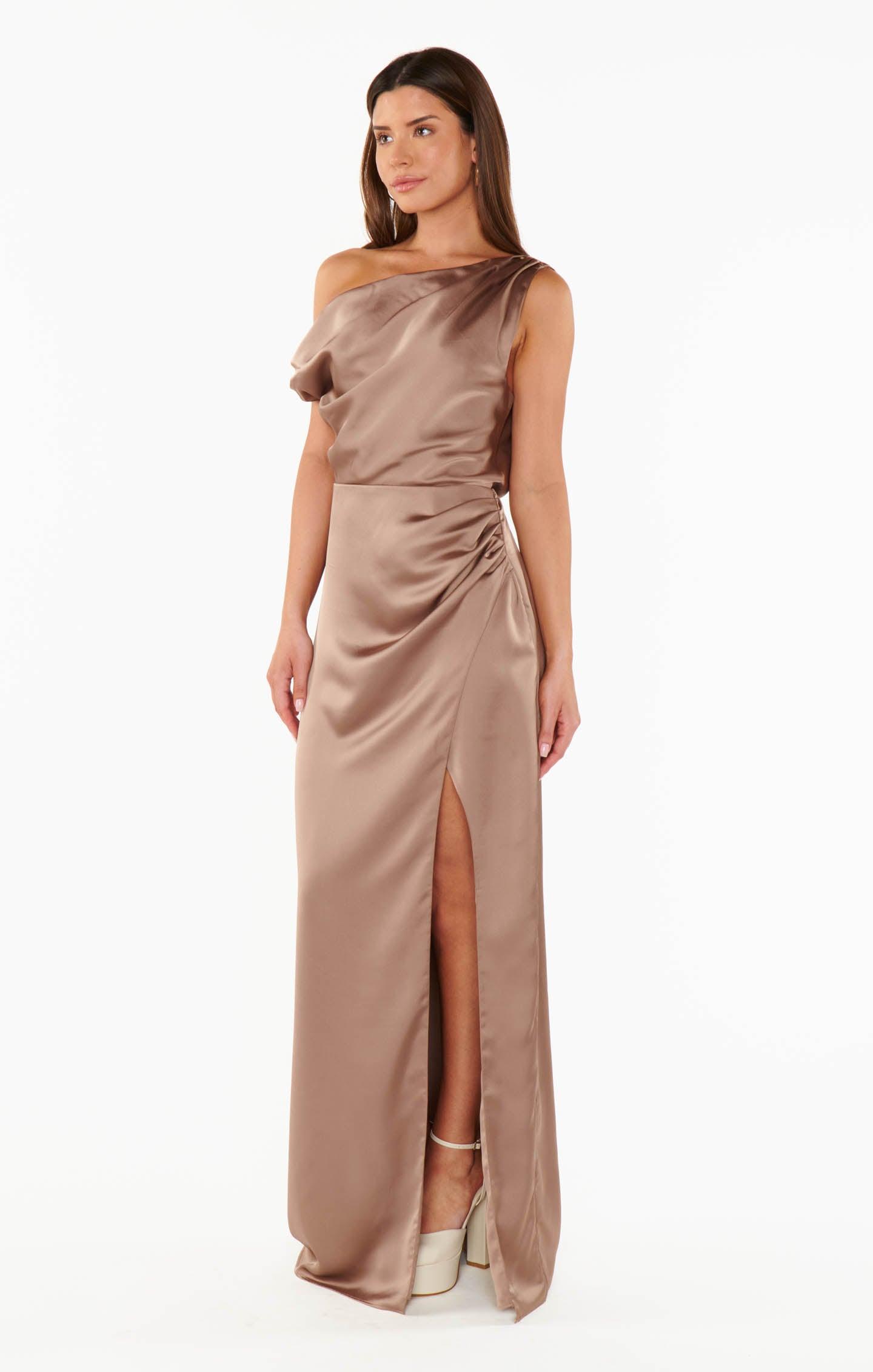 Chic and sophisticated in the Jodie Dress. An elegant asymmetrical silhouette crafted in luxe satin with a draped neckline and sultry side slit. Styled with dainty heels and minimal jewelry make the perfect event attire.FIT TIP: We recommend sizing down