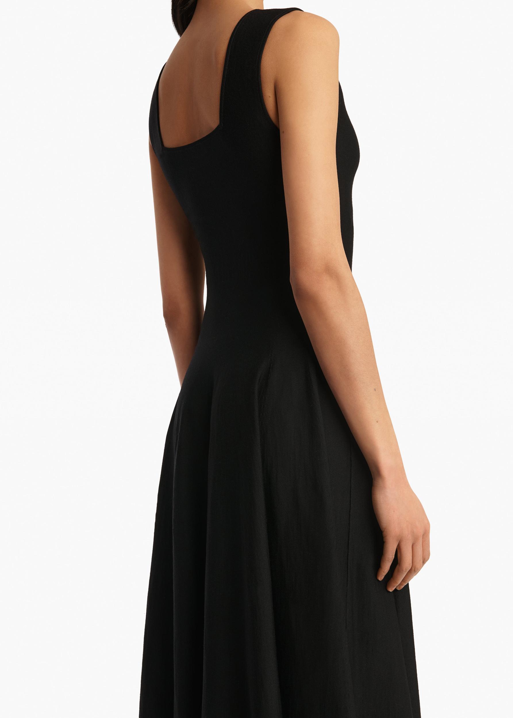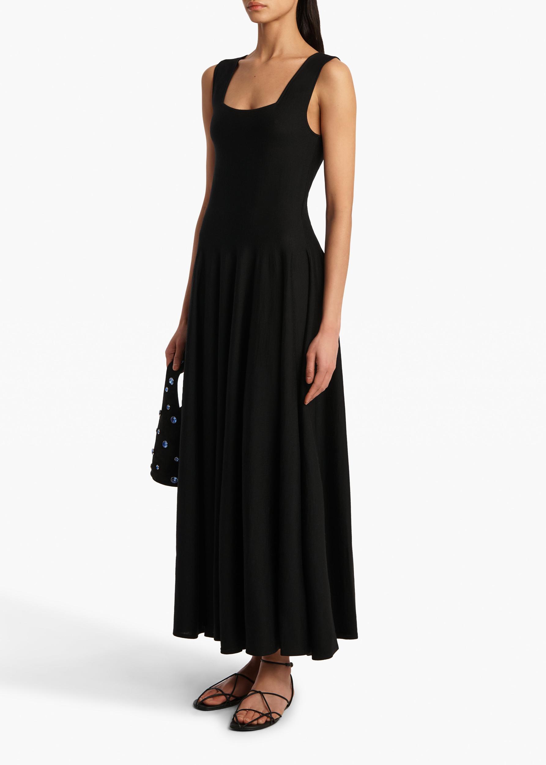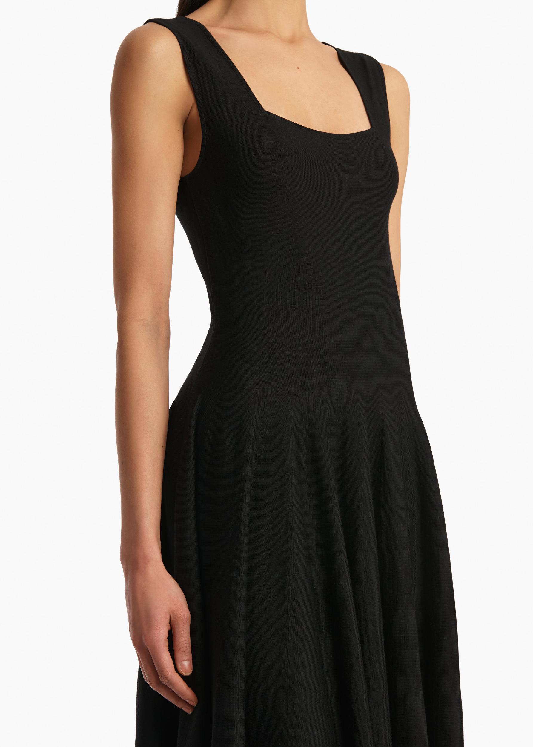 A sleeveless knit dress of fine Merino wool. Sleek square neckline mirrored at back. Engineered for volume at the beautifully draping skirt. Slips on.