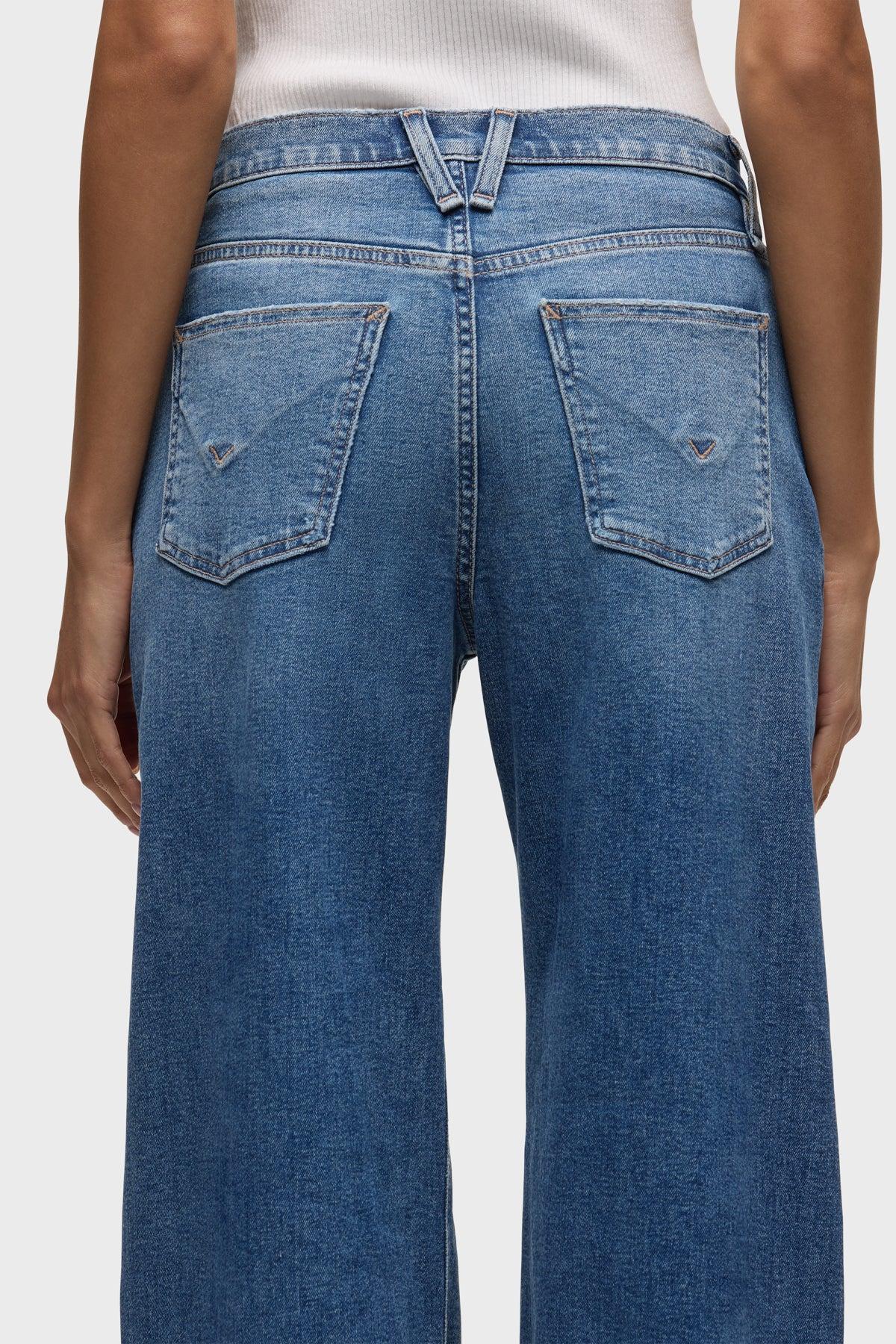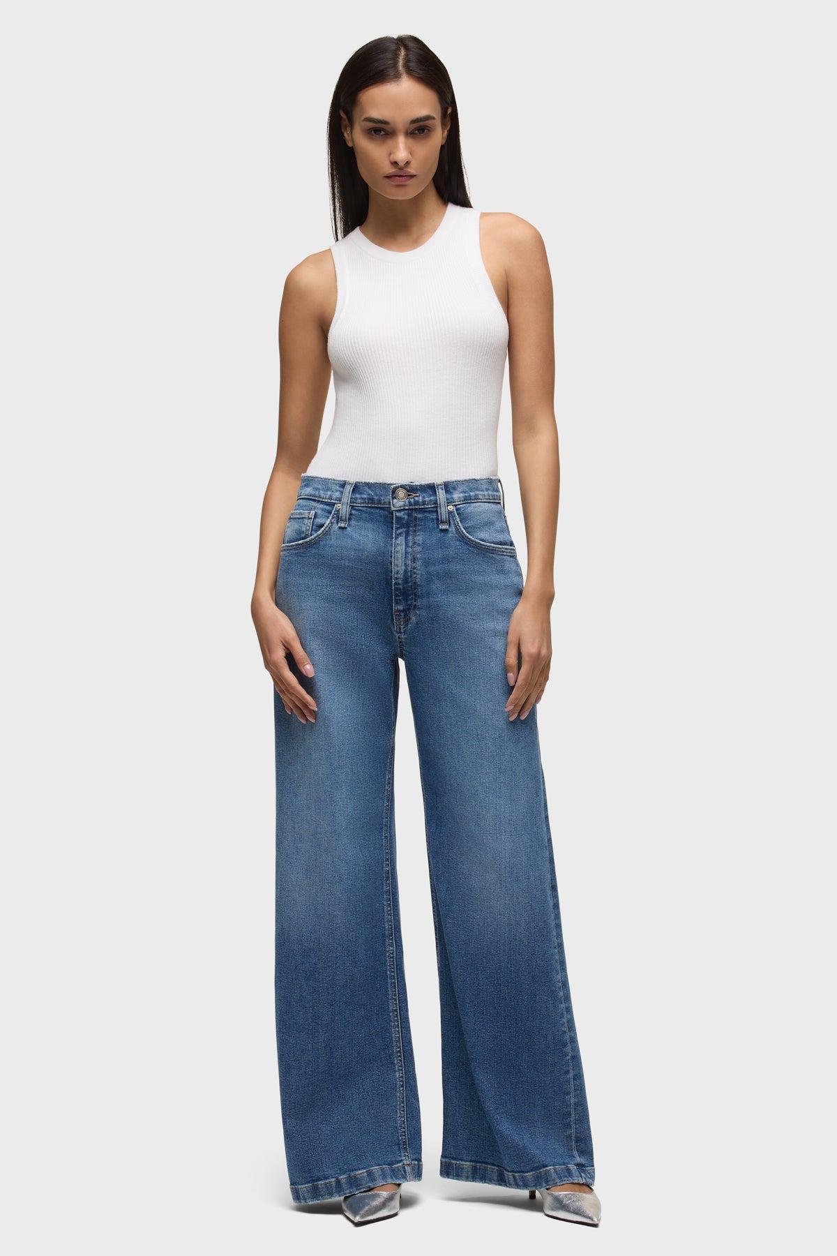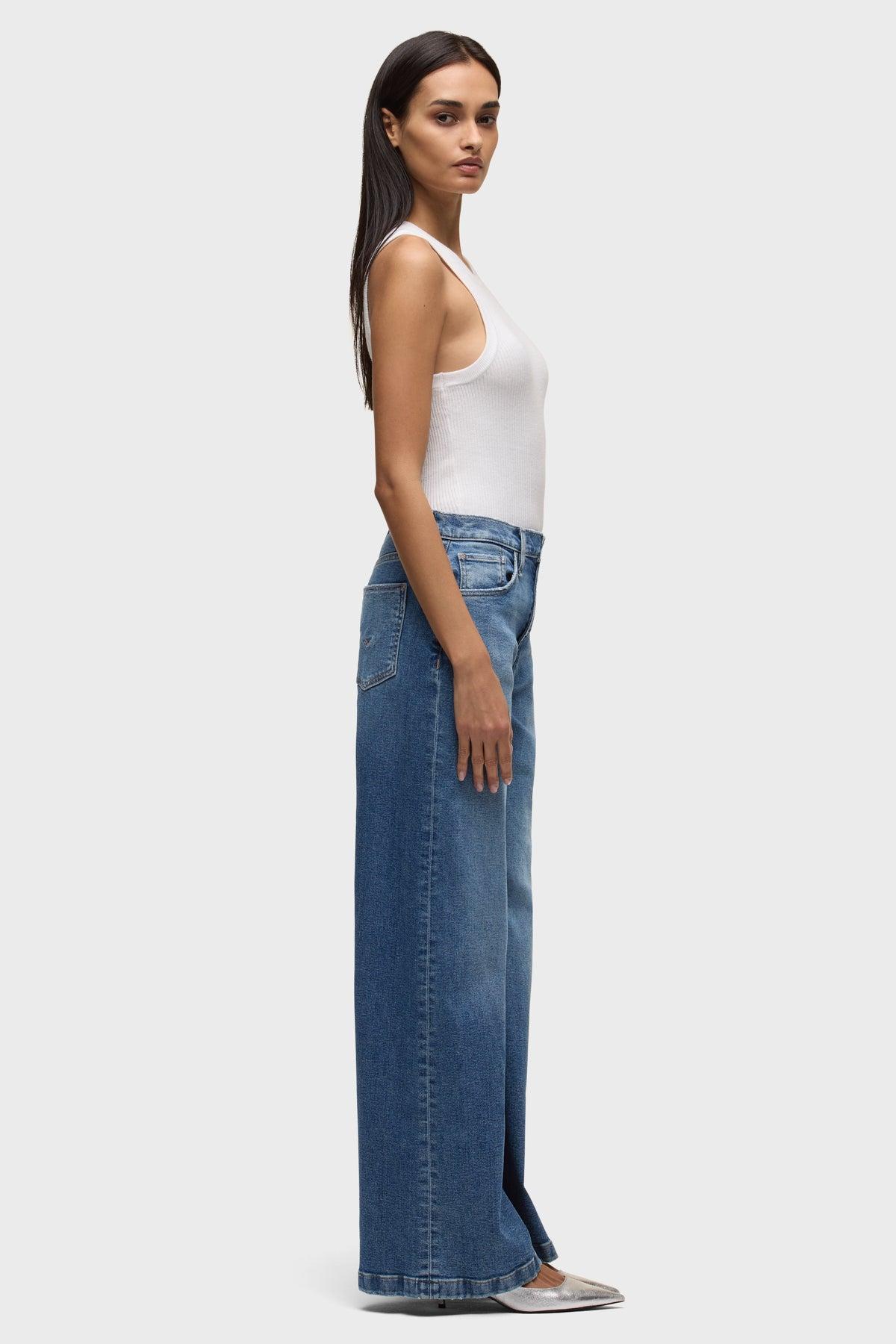 Description Our Jodie High Rise Loose Fit Wide Leg Jean in Lunar has a flattering, roomy fit with a 32" inseam and a clean finished hem. This pair is made of premium comfort stretch denim in a medium dark indigo wash with stone washing, whiskering and edge grinding. Product Details Front Rise: 12", Leg Opening: 25", Inseam: 32"Model Height 5'9"Model wearing size 25Measurements based on size 27 Fit & Care Content: 93% Cotton, 6% EME, 1% ElastaneMachine wash cold with like colorsDo not bleachTumble dry low or hang to dry