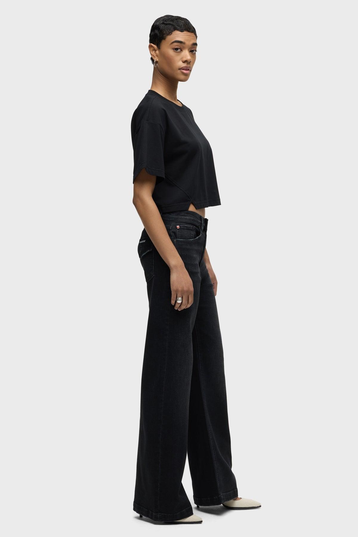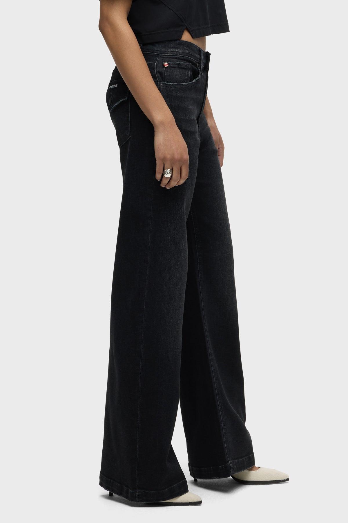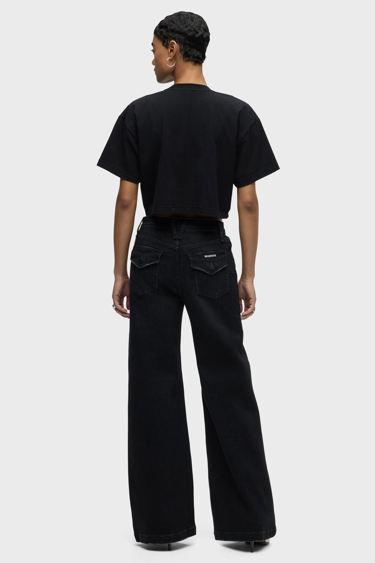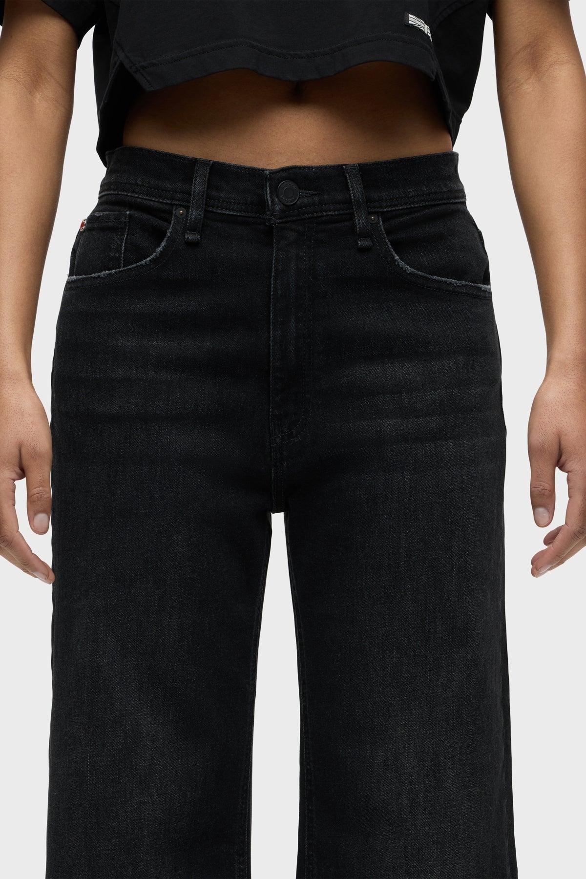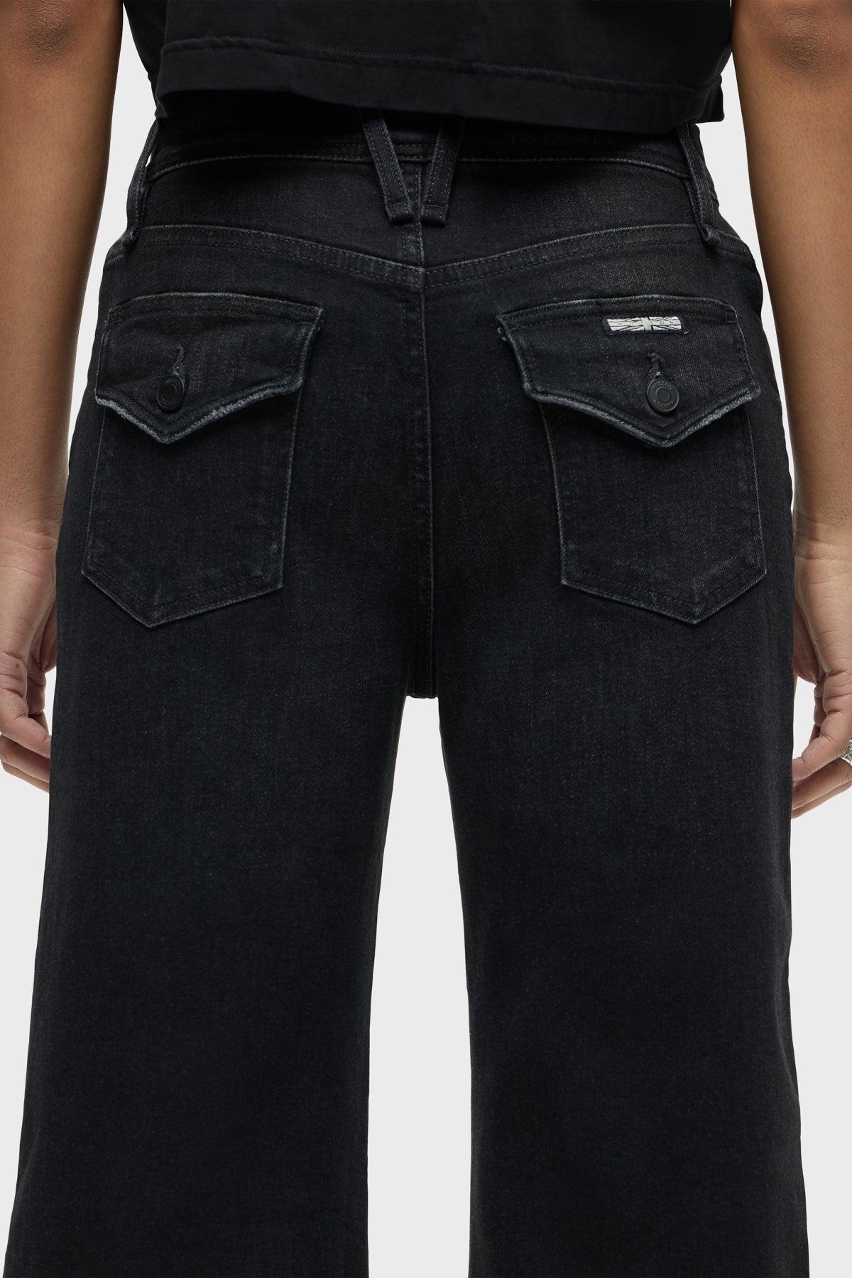 Description Our Jodie Loose Fit Wide Leg w/ Flap Jean in washed-black Ghost is cut in a must-own, roomy fit. The pair debuts for Fall with our updated button-flap pocket with a new modern shape. Finished with 32" inseam, the pair has whiskering, edge grinding and a finished hem. Product Details Front Rise: 11.75", Leg Opening: 24.5", Inseam: 32"Model Height 5'9"Model wearing size 25Measurements based on size 27 Fit & Care Content: 95% Cotton, 4% Elasterell, 1% ElastaneMachine wash cold with like colorsDo not bleachTumble dry low or hang to dry