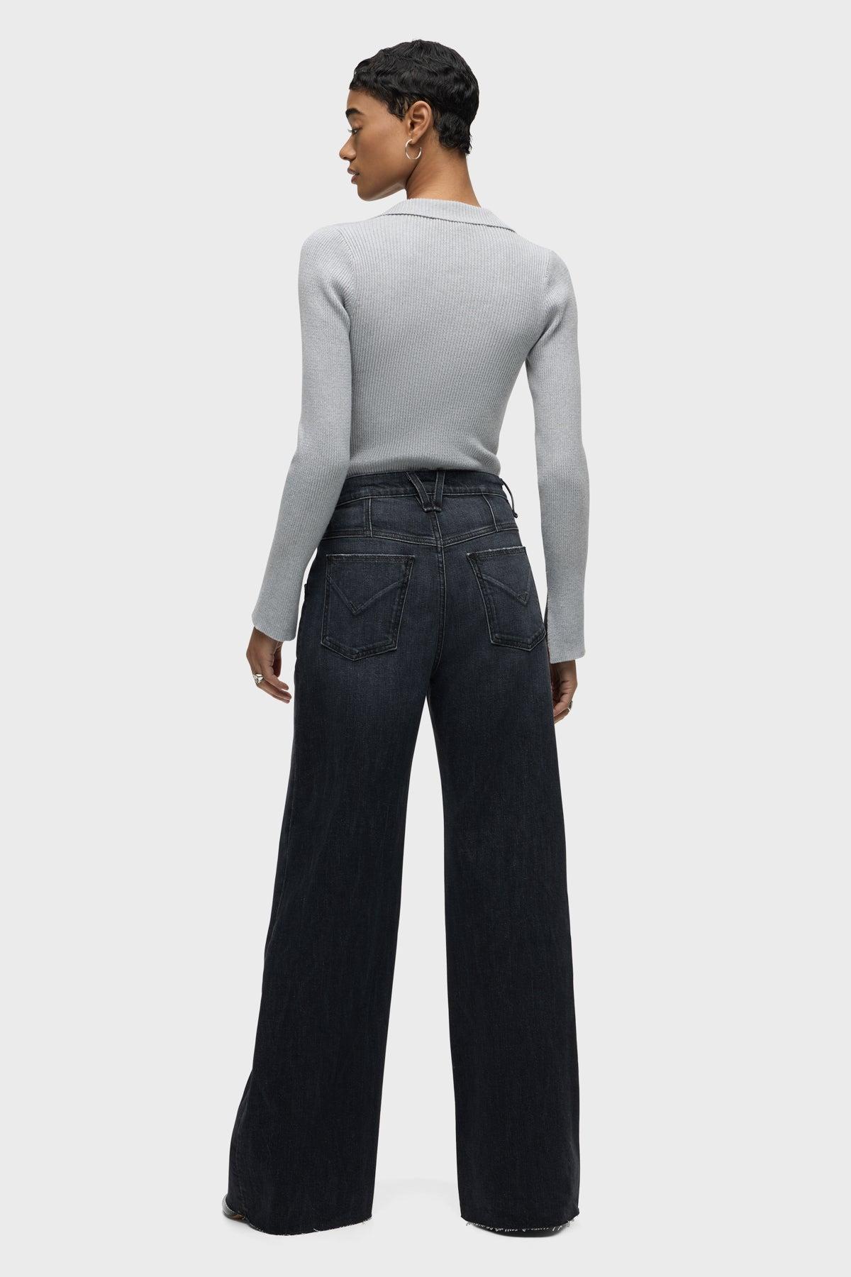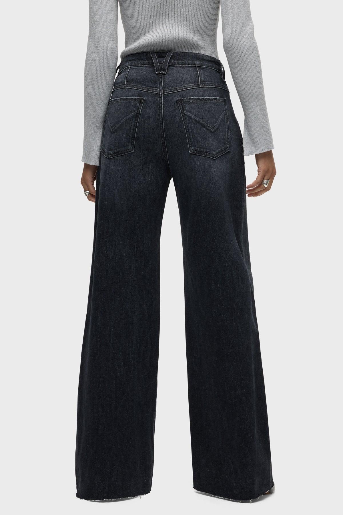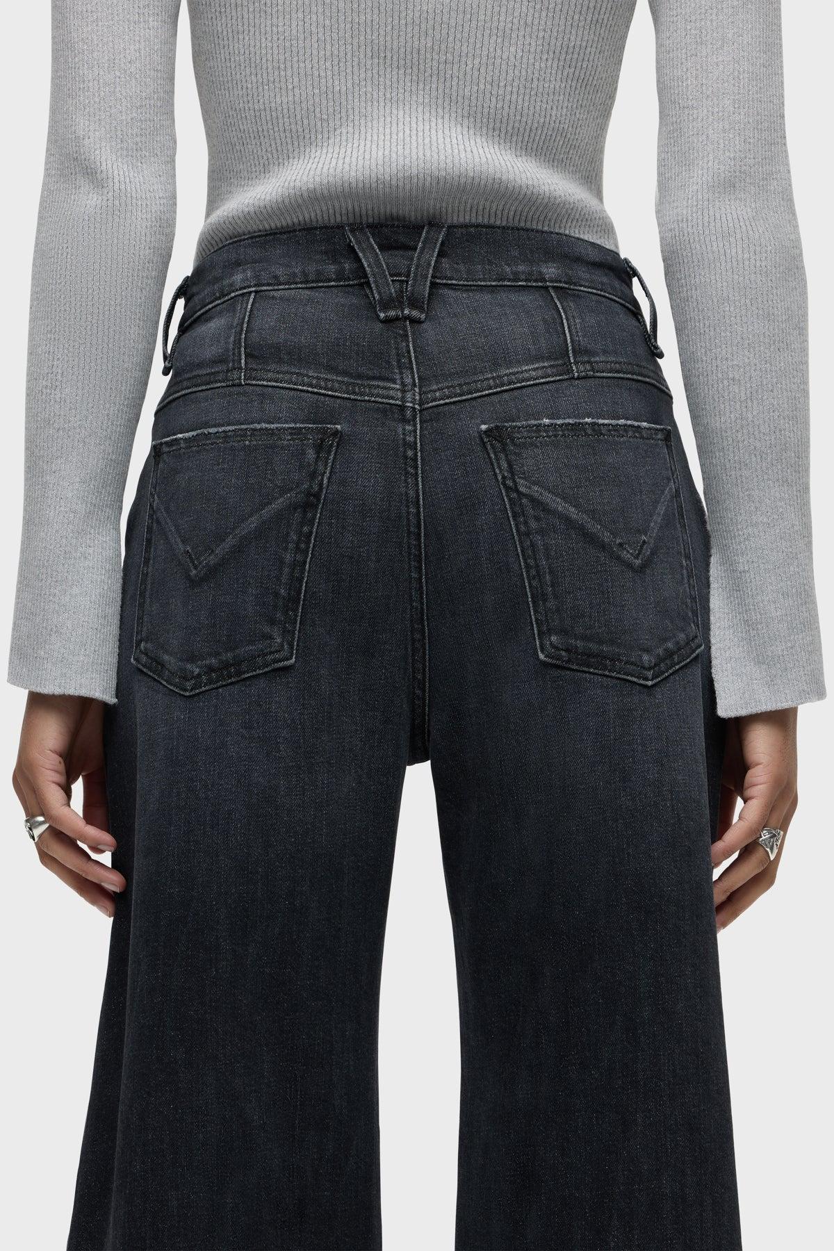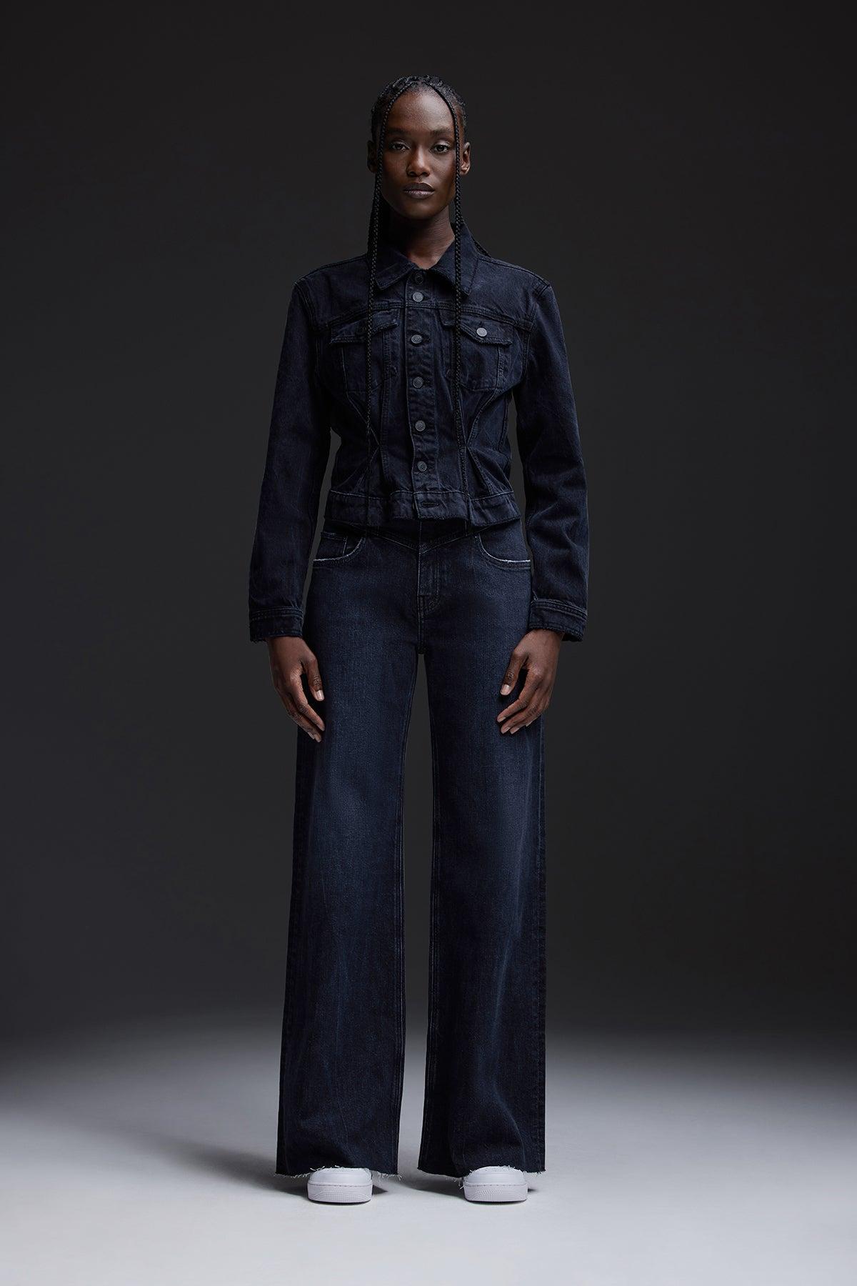 Description Our Jodie Seamed Front Yoke Wide Leg Jean in a washed black Milano Noir is cut for a roomy fit from true comfort stretch denim. Finished with 32" inseam, front yoke corset-like seaming details, grinding along the edges and a raw hem. Product Details Front Rise: 12", Leg Opening: 25", Inseam: 32"Model Height 5'9"Model wearing size 25Measurements based on size 27 Fit & Care Content: 98% Cotton, 2% ElastaneMachine wash cold with like colorsDo not bleachTumble dry low or hang to dry