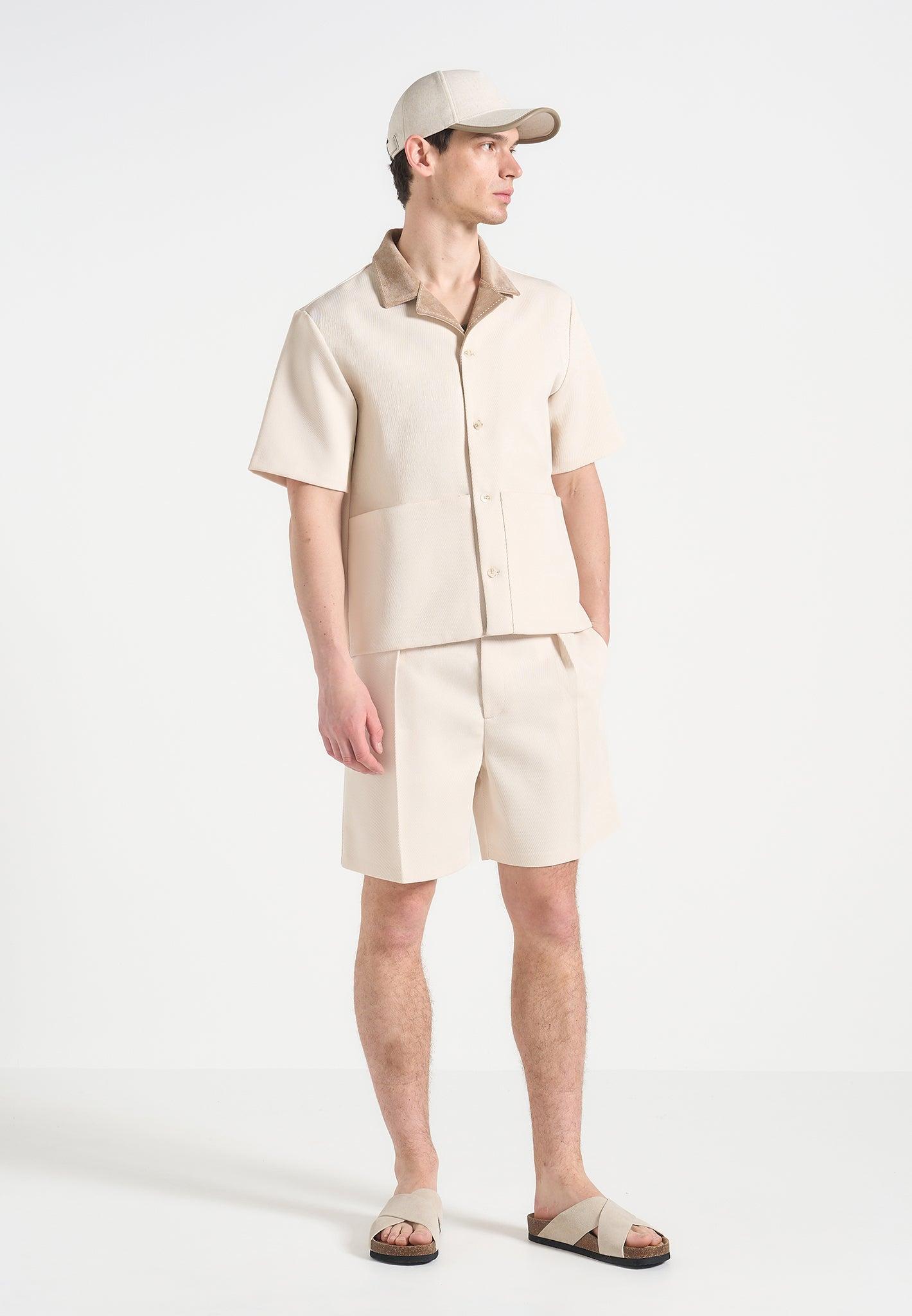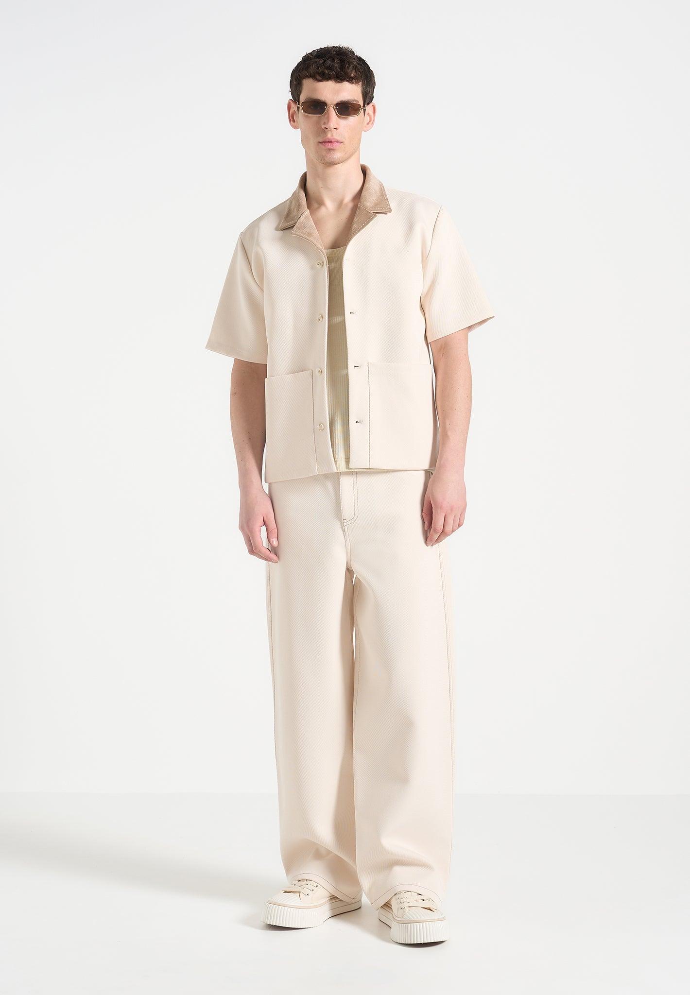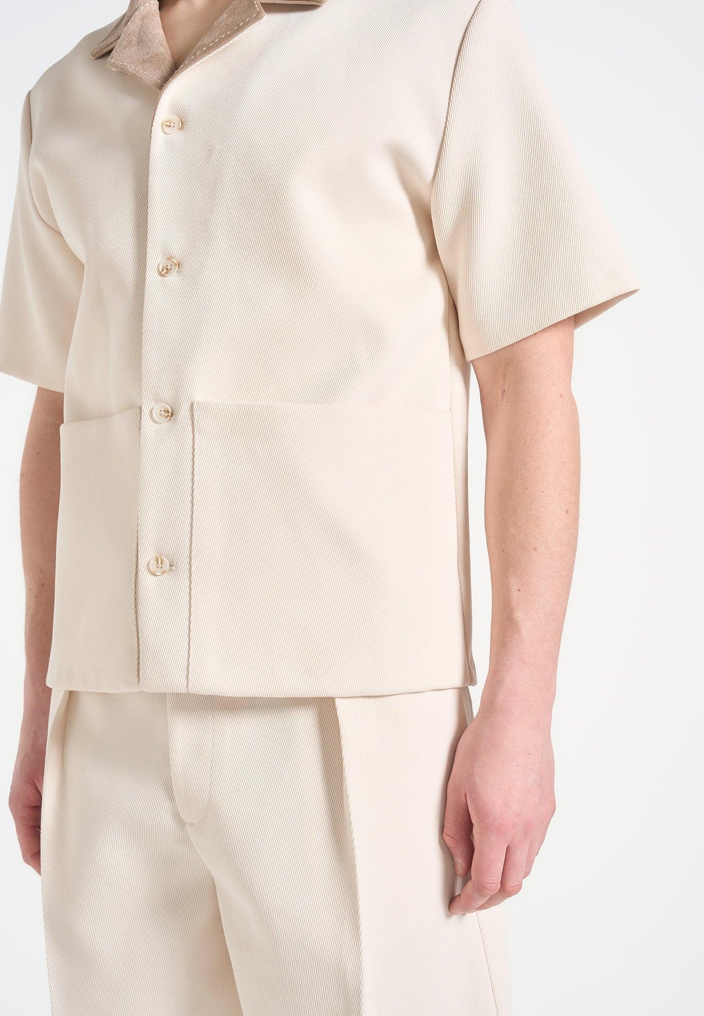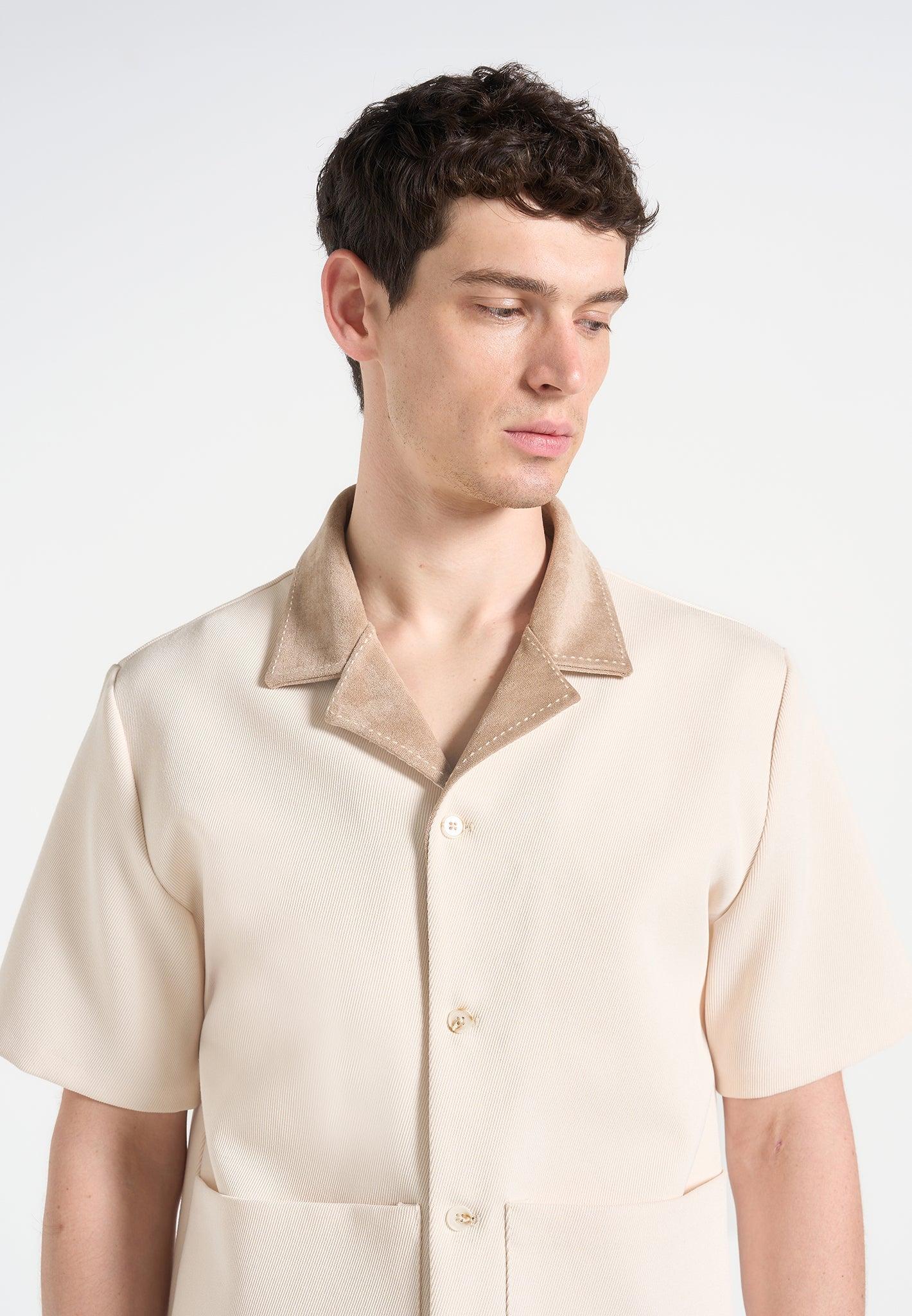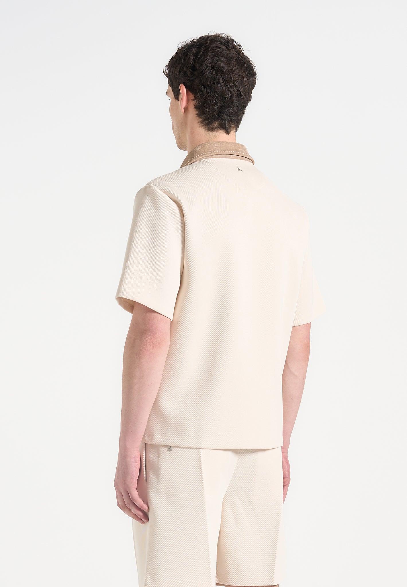 Balancing workwear influence with elevated detailing, the Twill Shirt With Contrast Suede Revere Collar is crafted from a structured twill weave and anchored by a soft-touch suede collar. The boxy cut is sharpened by clean lines and tonal buttons, while the revere collar adds a refined edge in a contrasting texture. Structured Twill Body with Architectural Shape Contrast Suede Revere Collar for Tactile Dimension Relaxed Silhouette for Modern Fit Clean Front Placket with Tonal Buttons Precision-Cut Panel Lines for Elevated Construction Silver Manière De Voir Eiffel Plaque on Back 80% Polyester 17% Viscose 3% Elastane / 95% Polyester 5% Elastane Always check the care label for wash instructions.