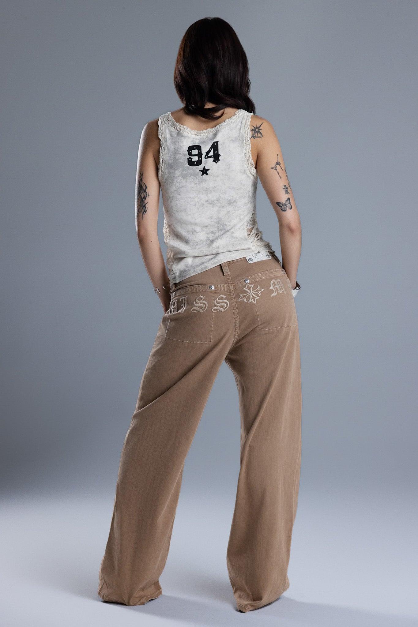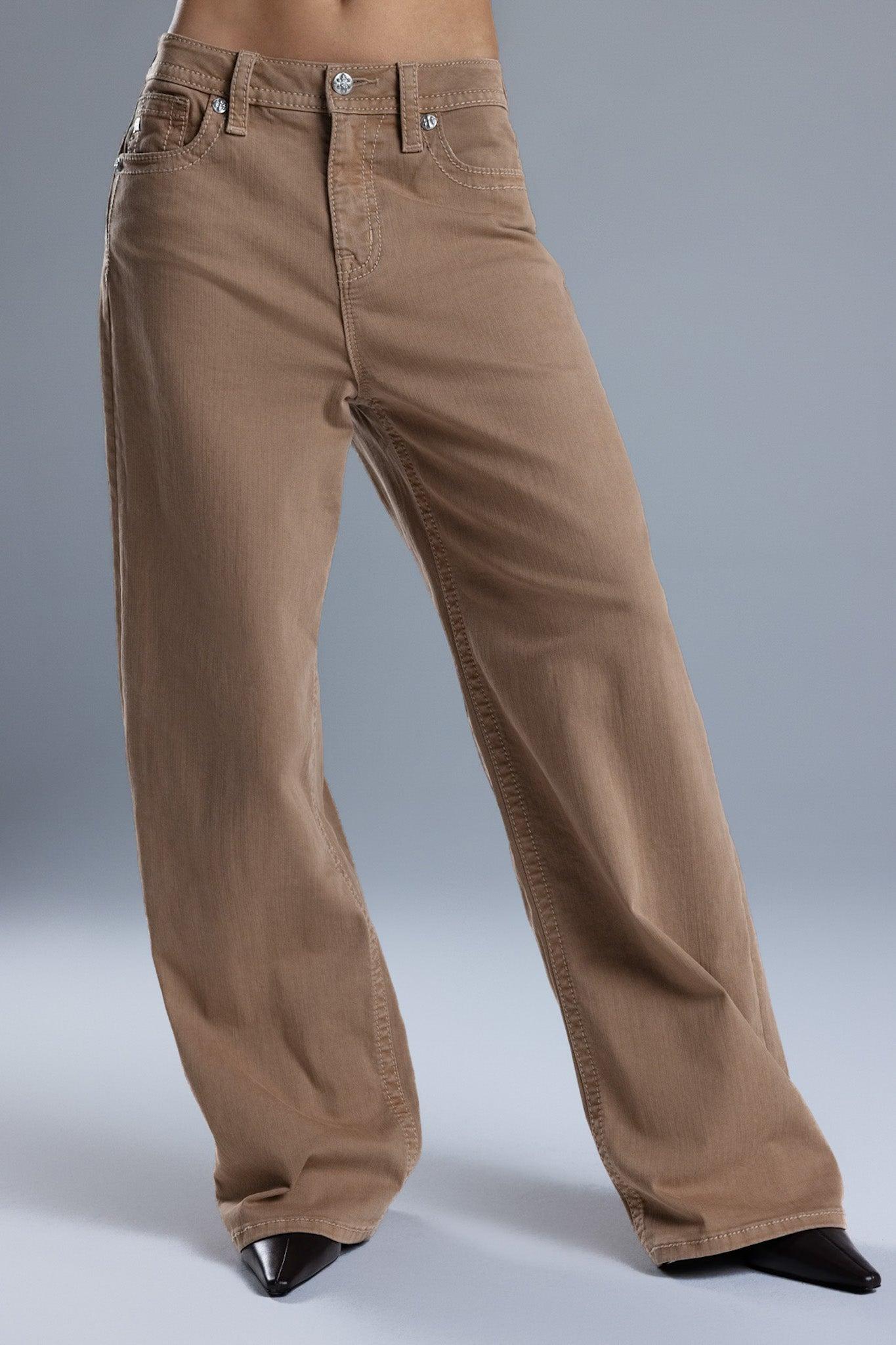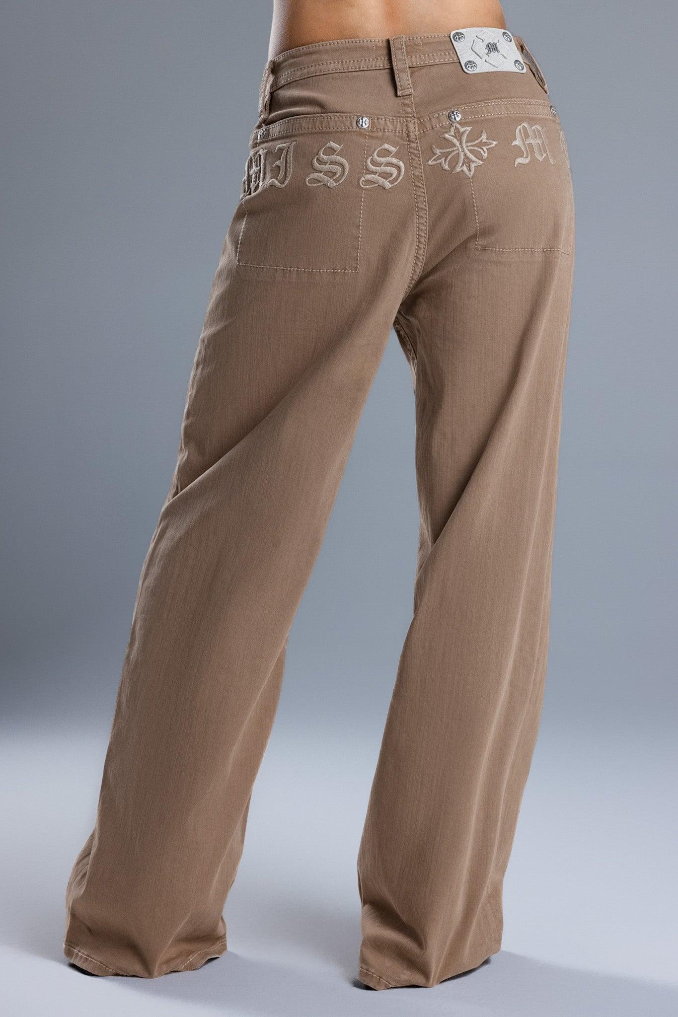 Low to mid-rise baggy wide khakis- Embroidered gothic Miss Me script design- Structured square back pocket construction- Embossed white studded leather cross Miss Me brand patch- 5-pocket design Model is wearing size: 25 Model Measurements:Height: 5'9"Bust: 34"Waist: 26"Hips: 35" Fabric Content: 64% Cotton, 23% Poly, 10% Viscose, 3% Elastane Care: Gentle machine wash inside-out with like colors in cold water. Tumble dry low. Style No. 2391BW2S-TAN, 2391BW2V-TAN