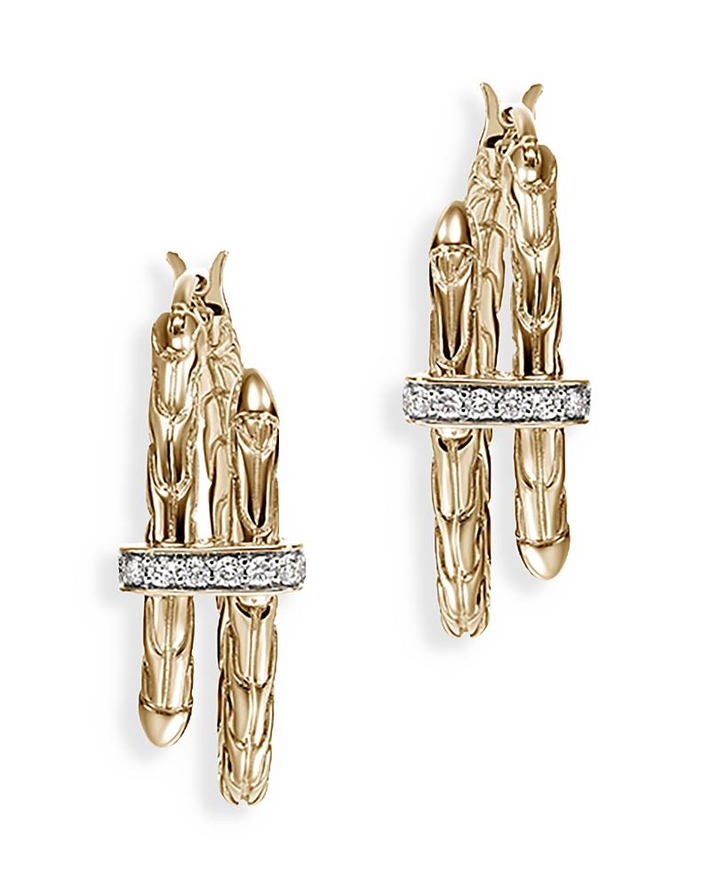 From the Chain Classic Collection. John Hardys Spear small hoop earrings feature signature engraved detailing centered by a bar of glittering diamond pav. Diamonds, 0.12 tcw Diamond color: I-J Diamond clarity: I1 14K yellow gold Latch back Imported SIZE About 0.67 diameter. Fashion Jewelry - John Hardy > John Hardy > Saks Fifth Avenue > Barneys. John Hardy. Color: Yellow Gold.
