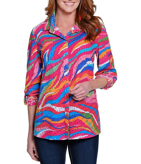 From John Mark , this blouse features:Woven fabricationPoint collarLong roll-tab sleevesWatercolor printLoose fitAllover eyelet embroideryShirttail hem with side ventsButton-front closureApprox. 29" front; 29.5" back lengthSelf: cotton, embroidery: cottonMachine wash/tumble dry lowImported.