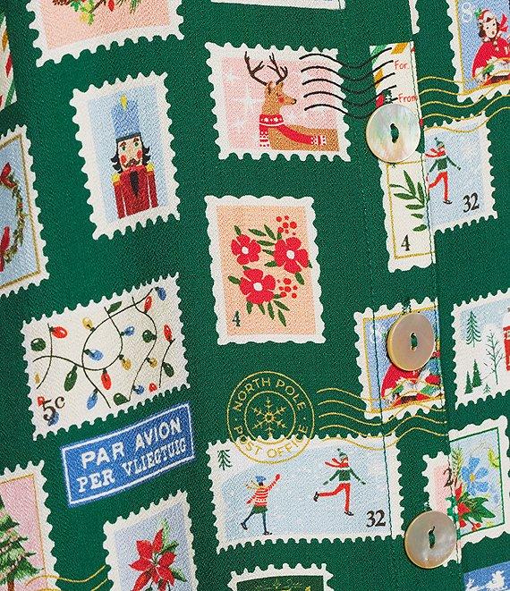 John Mark Christmas Novelty Stamp Print Wire Collar 3/4 Cinched Tie Sleeve Button Front Blouse