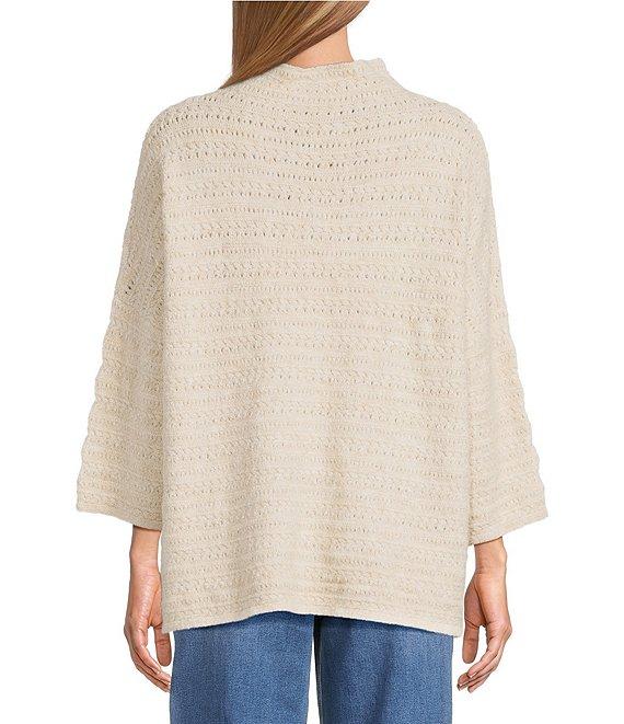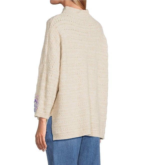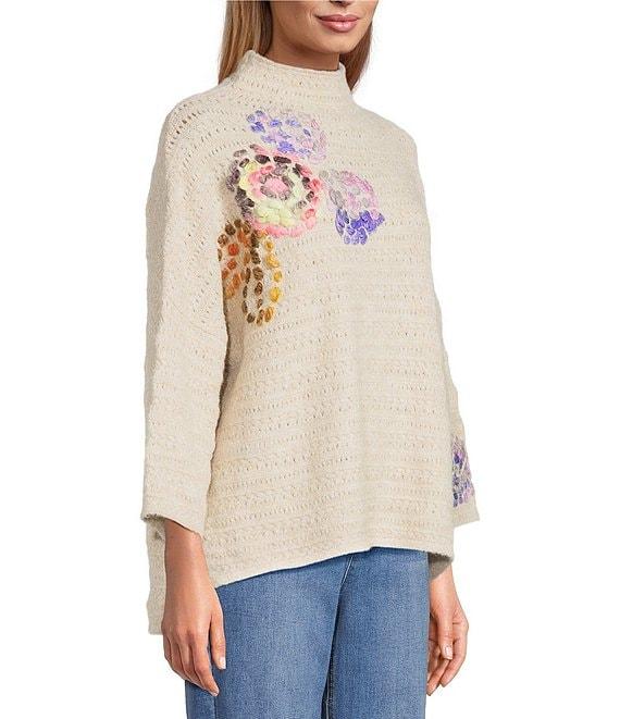 From John Mark, this sweater features: Knit fabrication Mock neckline 3/4 sleeves Embroidery flower on shoulder and end of sleeves Loose fit Pullover construction Approx. 22.5" length Polyester/nylon/wool/spandex Turn inside out-machine wash/dry flat Imported.
