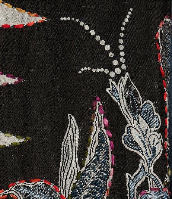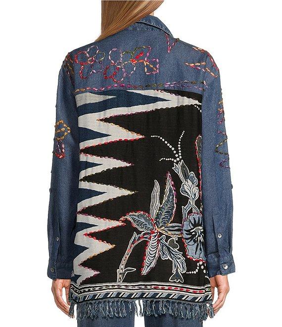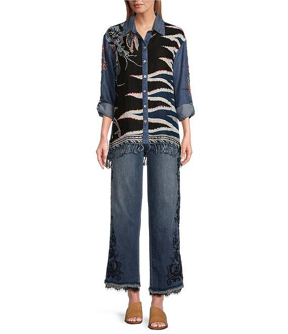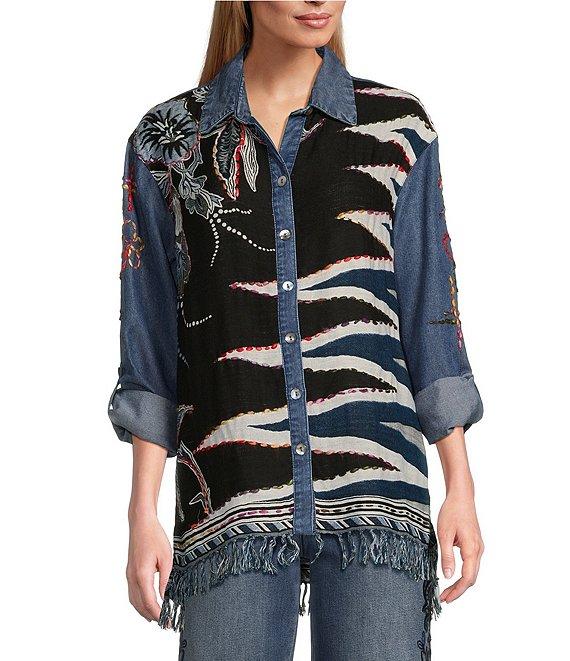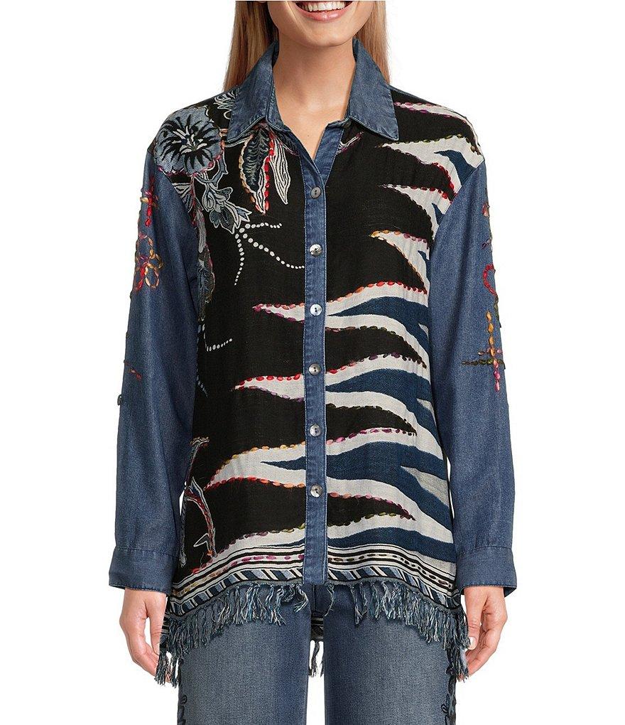 From John Mark, this blouse features: Woven fabrication Point collar neckline Long rolled-tab sleeves with buttoned cuffs Loose fit Floral and butterfly embroidery motif Fringe yarns at hem Button front closure Approx. 28" front; 29.5"back length Bodice: rayon; solid: lyocell Hand wash/line dry Imported.