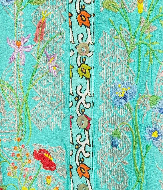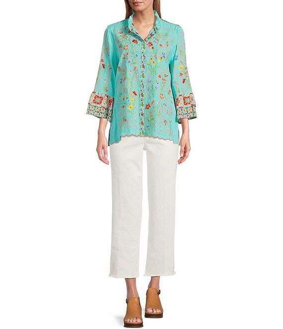 From John Mark, this blouse features: Woven fabrication Round ruffle neckline 3/4 ruffle tiered flounce sleeves Floral embroidery motif Button-front closure Approx. 27" center front length; 28" center back Rayon/viscose; ruffle sleeves: viscose; exclusive of decoration Machine wash Imported.