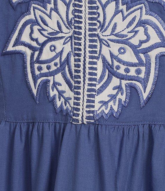 From John Mark, this dress features: Woven fabrication A-line silhouette Split V-neckline 3/4 bubble sleeves Floral embroidered motif Side seam pockets Tiered skirt Pullover construction Approx. 46" length Self and sleeve: cotton; embellishments: polyester; exclusive of decoration Machine wash cold/tumble dry low Imported.