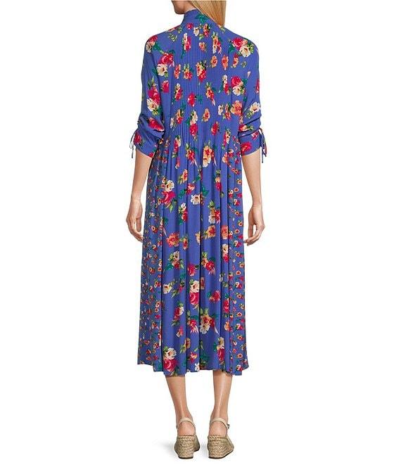From John Mark, this dress features Woven fabrication Floral print design Wire neckline 3/4 sleeves with cinch tie Two side functional pockets Loose fit Straight hemline Front button closure Approx. 50.375" central front, 50" central back Viscose/rayon Machine wash cold/tumble dry low Imported.