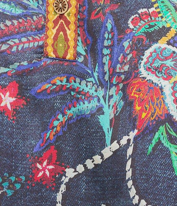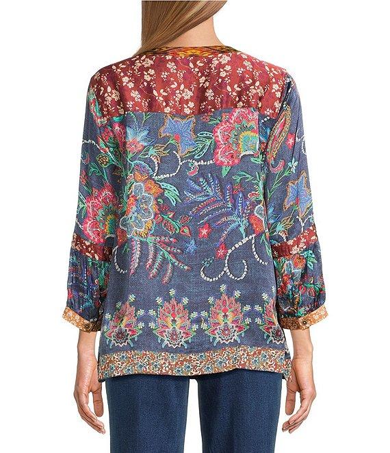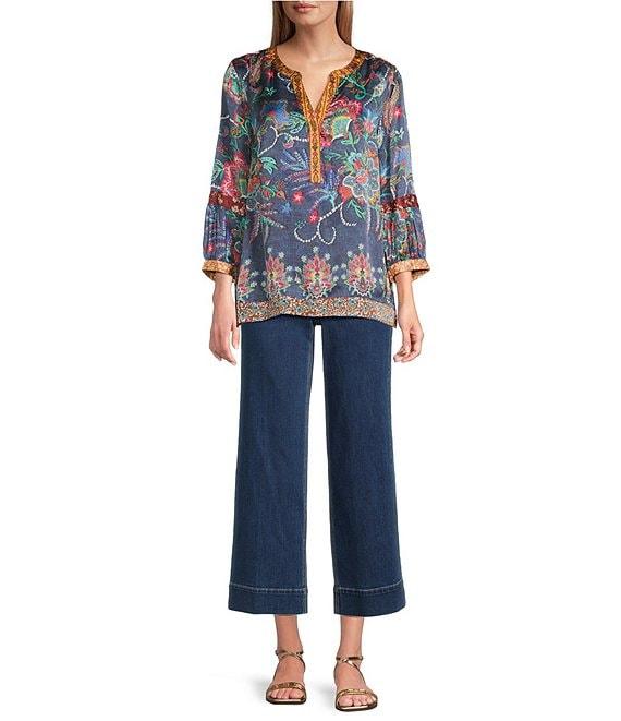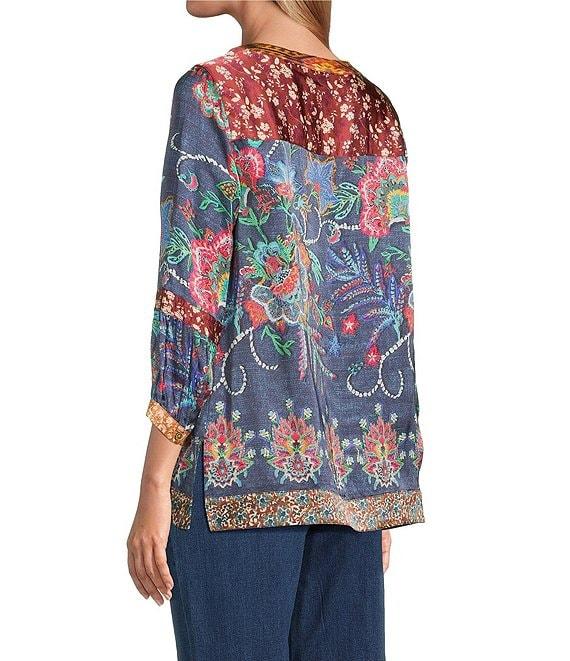 From John Mark Petite, this tunic features: Split y-neckline 3/4 sleeves button cuffs Multi floral print Stripe print neck line Yoke sleeve inset Yellow paisley cuffs and at hem Loose fit Straight hemline with side vents Pullover construction Approx. 25" length Rayon/viscose Machine wash/tumble dry Imported.