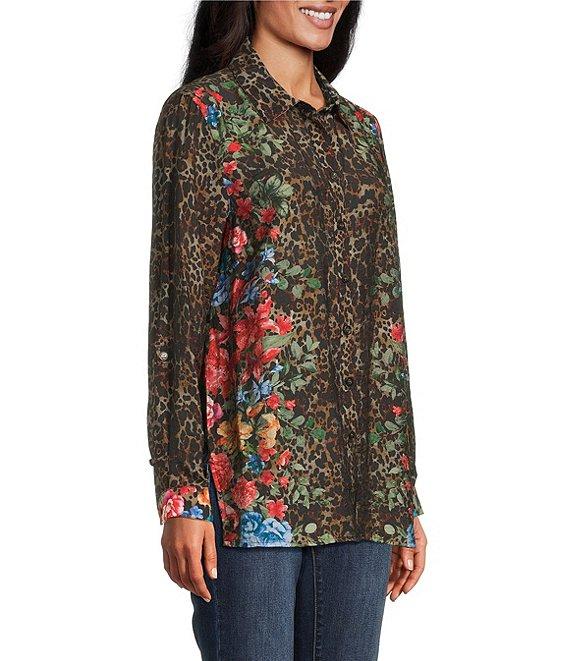 From John Mark Petite, this tunic features: Woven fabrication Point collar Long roll-tab sleeves Loose fit Animal skin floral printed Straight high-low hem with side vents Button-front closure Approx. 26.25" front length; 26.75" back length Rayon/nylon Machine wash/tumble dry Imported.