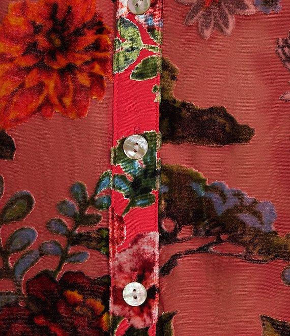 From John Mark Petite, this blouse features: Burnout velvet woven fabrication Ruffled round neckline Long sleeves with ruffle button cuffs Floral/cheetah animal print Loose fit Button-front closure Approx. 26.25" length Rayon/nylon Machine wash Imported.