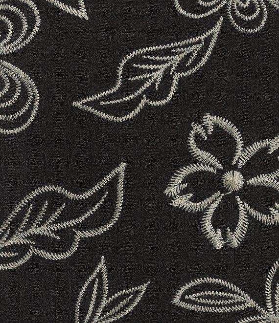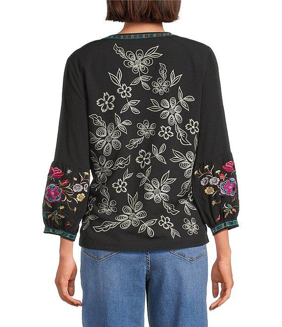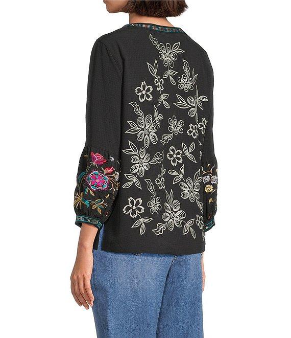 From John Mark, this top features: Split v-neckline 3/4 tiered sleeves with buttoned cuffs Floral embroidered motif Loose Slight hi-low hem with side vents Pullover construction Approx. 25" center-front length; 25.5" center-back length Polyester/spandex, exclusive of decoration Machine wash cold Imported.