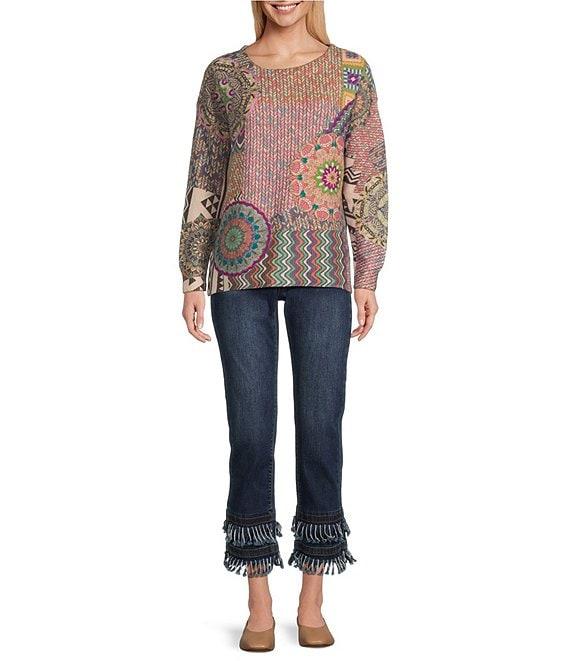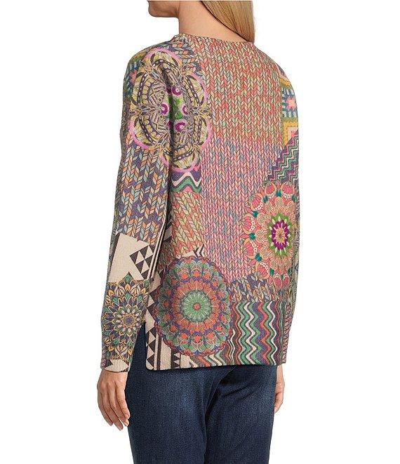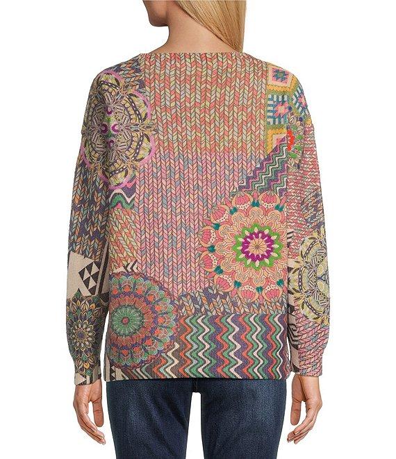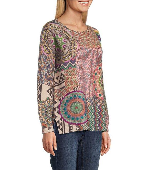 From John Mark, this sweater features: Crew neckline Long sleeves Patchwork print Loose fit Felting detail at body and shoulders Straight hem with side vents Pullover construction Approx. 25" length Polyester/nylon; exclusive of decoration Machine wash/tumble dry low Imported.