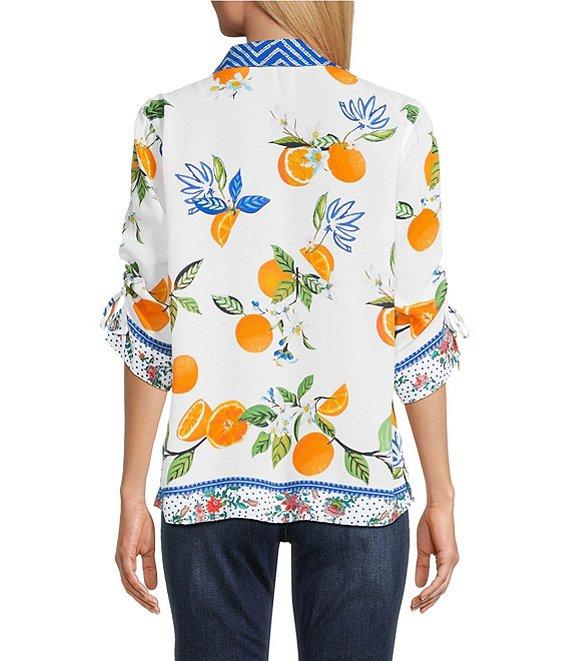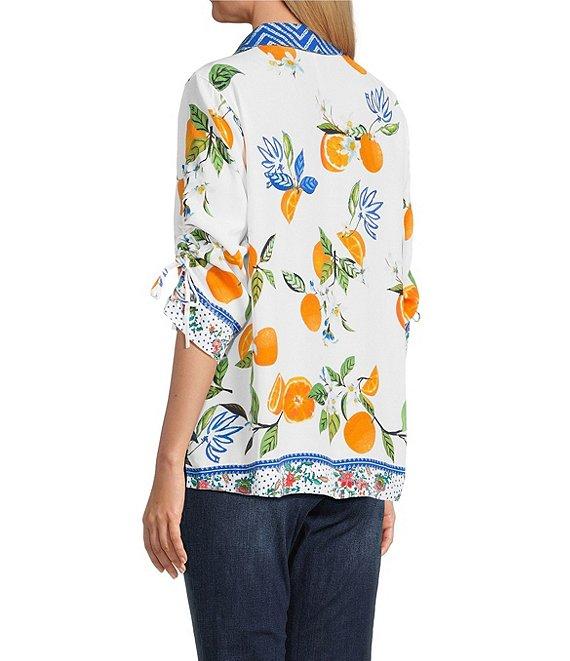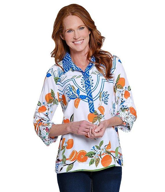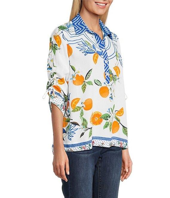 From John Mark Petite, this tunic features: Woven fabrication Wire collar 3/4 cinch tie sleeves Tropical print and chevron border pattern Straight hem with side slits Pullover with half placket closure Approx. 26" center front length; 26.5" center back length Rayon/viscose Machine wash/tumble dry low Imported.