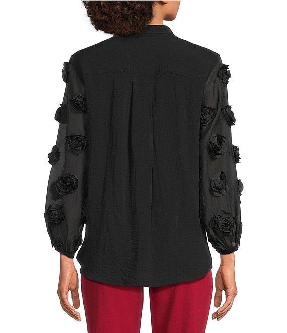 From John Mark Petite, this blouse features: Woven fabrication Wire collar 3/4 sleeves with button cuff Sheer 3D rosette sleeves Loose fit Curved hem with side vents Button-front closure Approx. 24.5" center front; 25" center back length Body: rayon/polyester; sleeves: polyester Machine wash Imported.